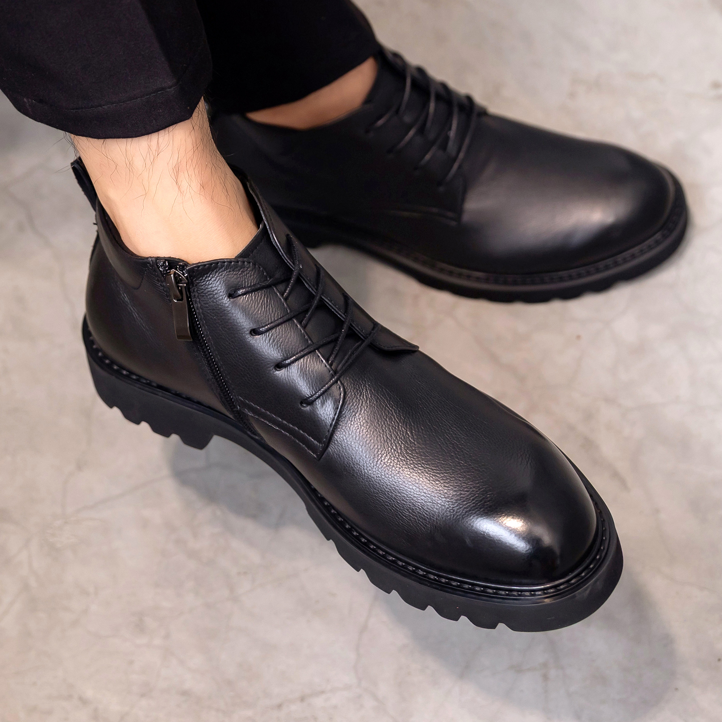 日系马丁靴男真皮系带侧拉链英伦短靴潮流休闲高帮短筒切尔丁靴子