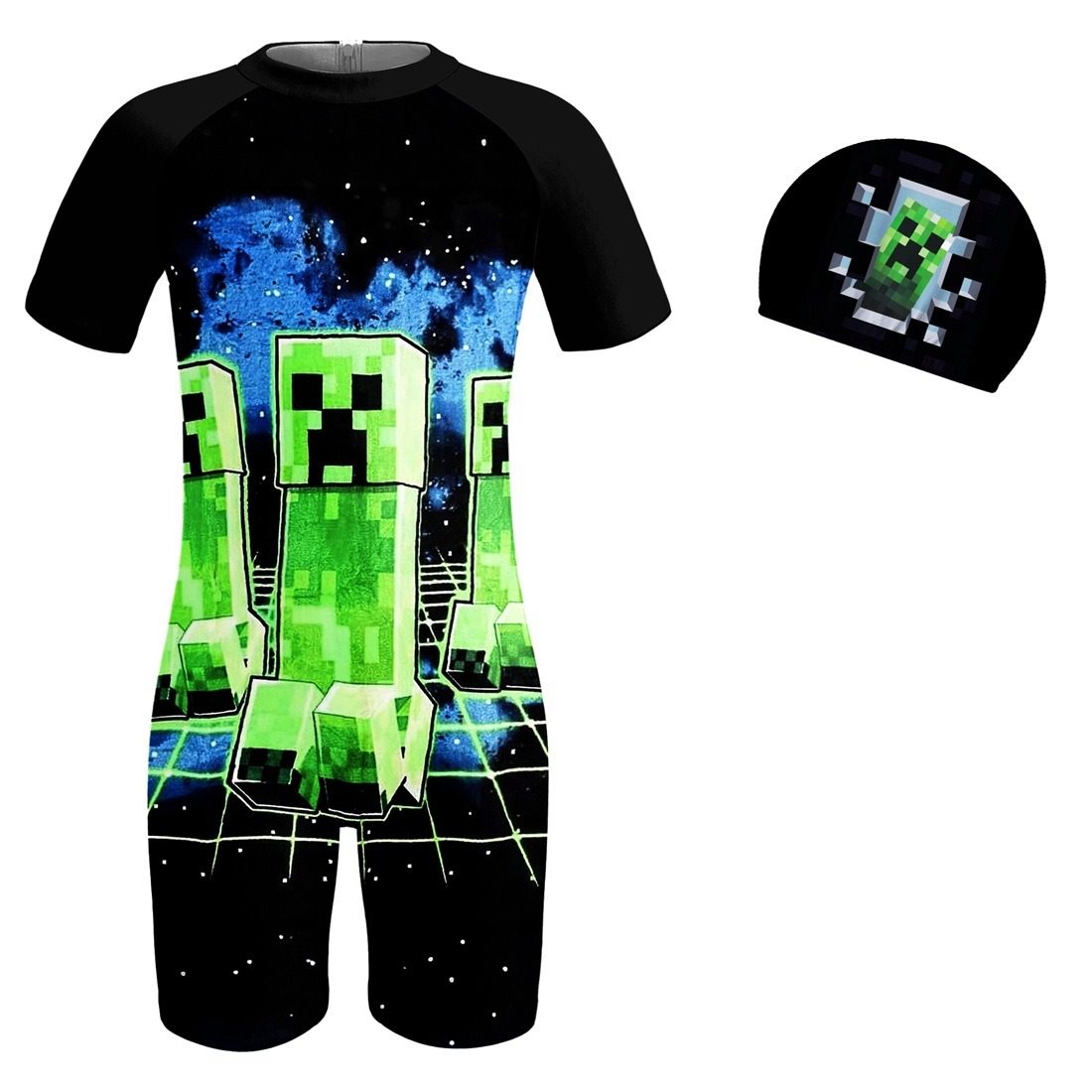 我的世界Minecraft儿童连体游泳装男孩卡通史蒂夫绿魔人泳衣套装