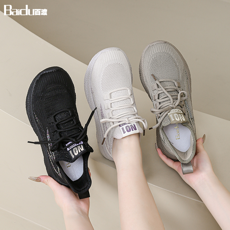 Baidu百渡春夏秋软底休闲鞋女士飞织透气轻便网面运动鞋旅游鞋
