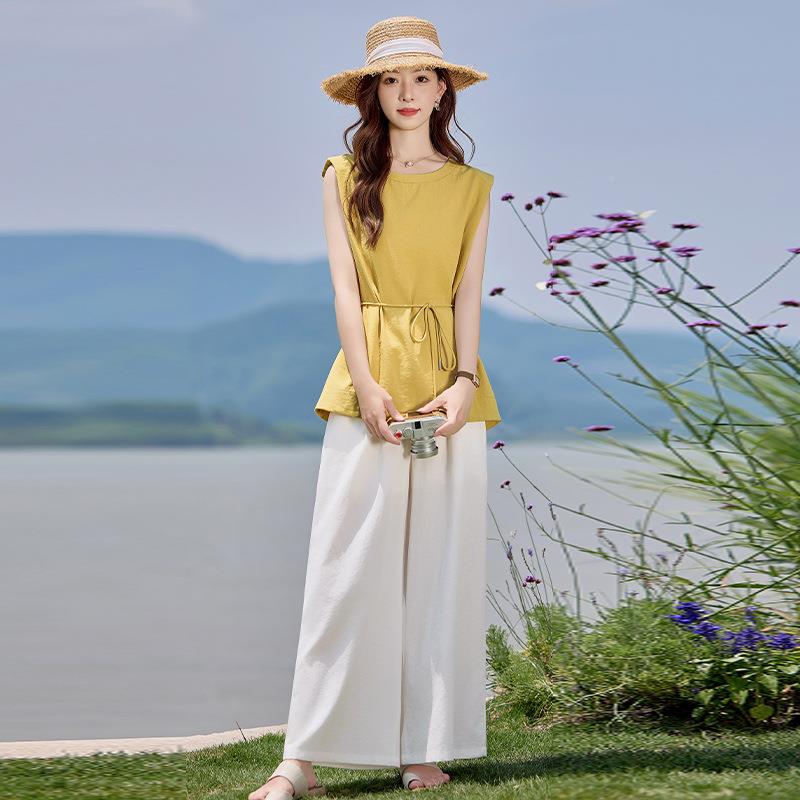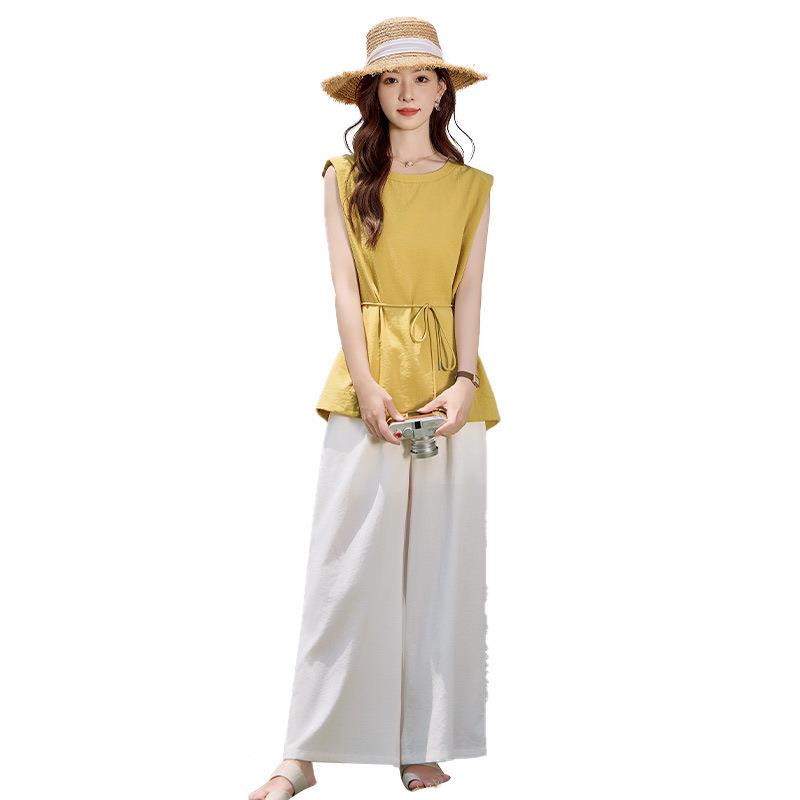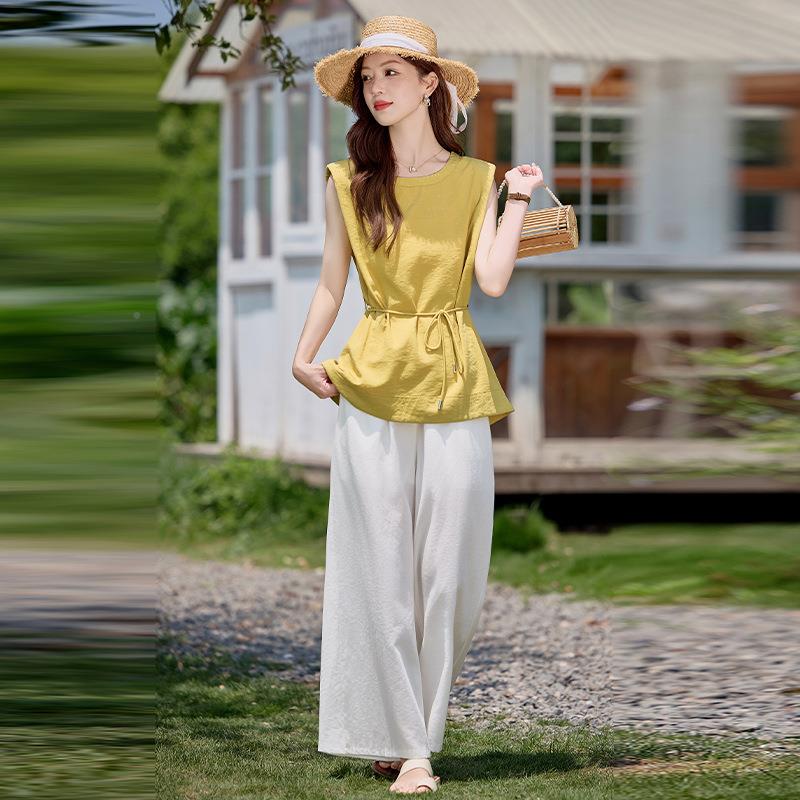 新无袖棉麻风套装女白夏季款时尚件休闲ZYI9028L减龄上衣色阔腿裤