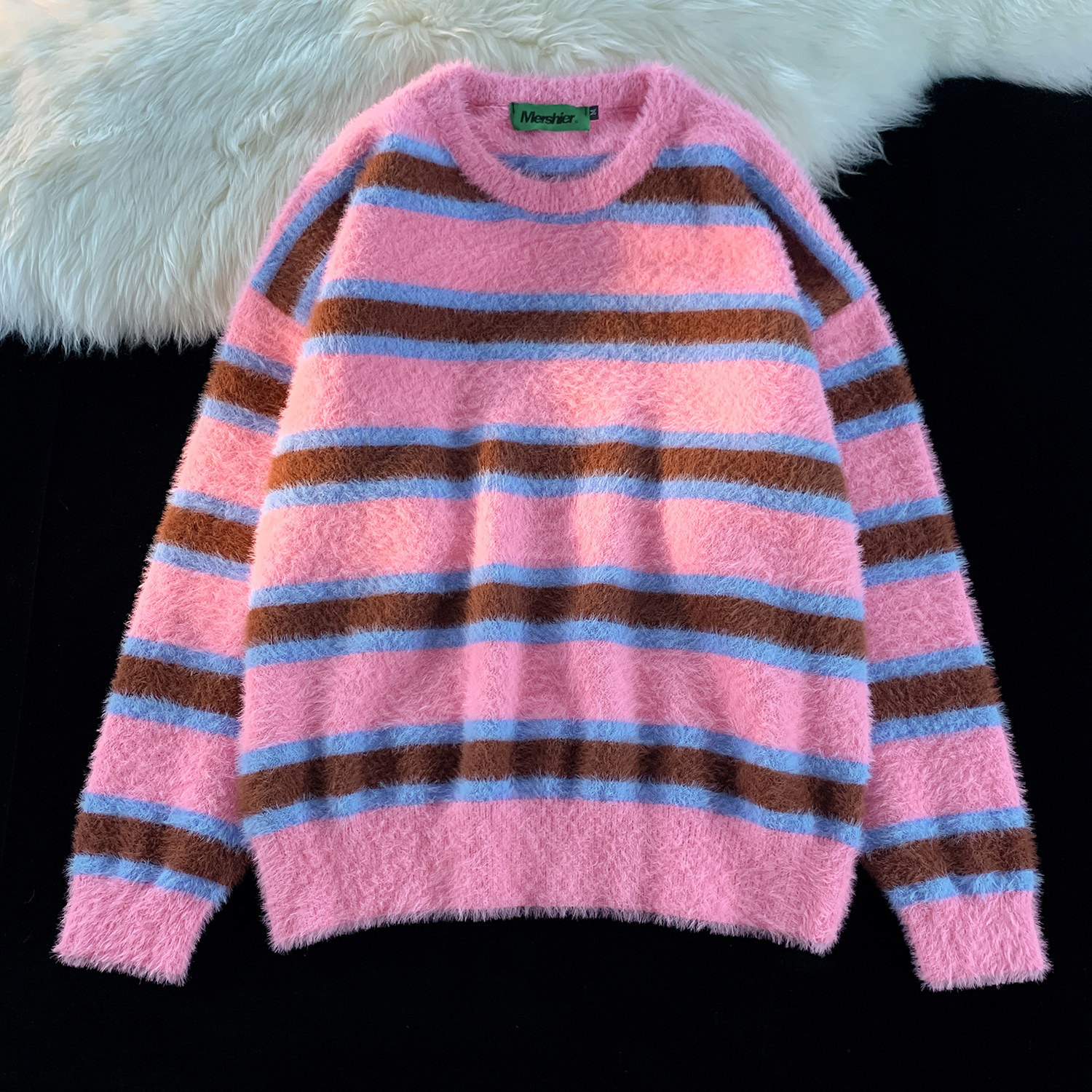 JIANYINZ软糯温柔粉色条纹慵懒风毛衣男女宽松复古ins甜辣针织衫