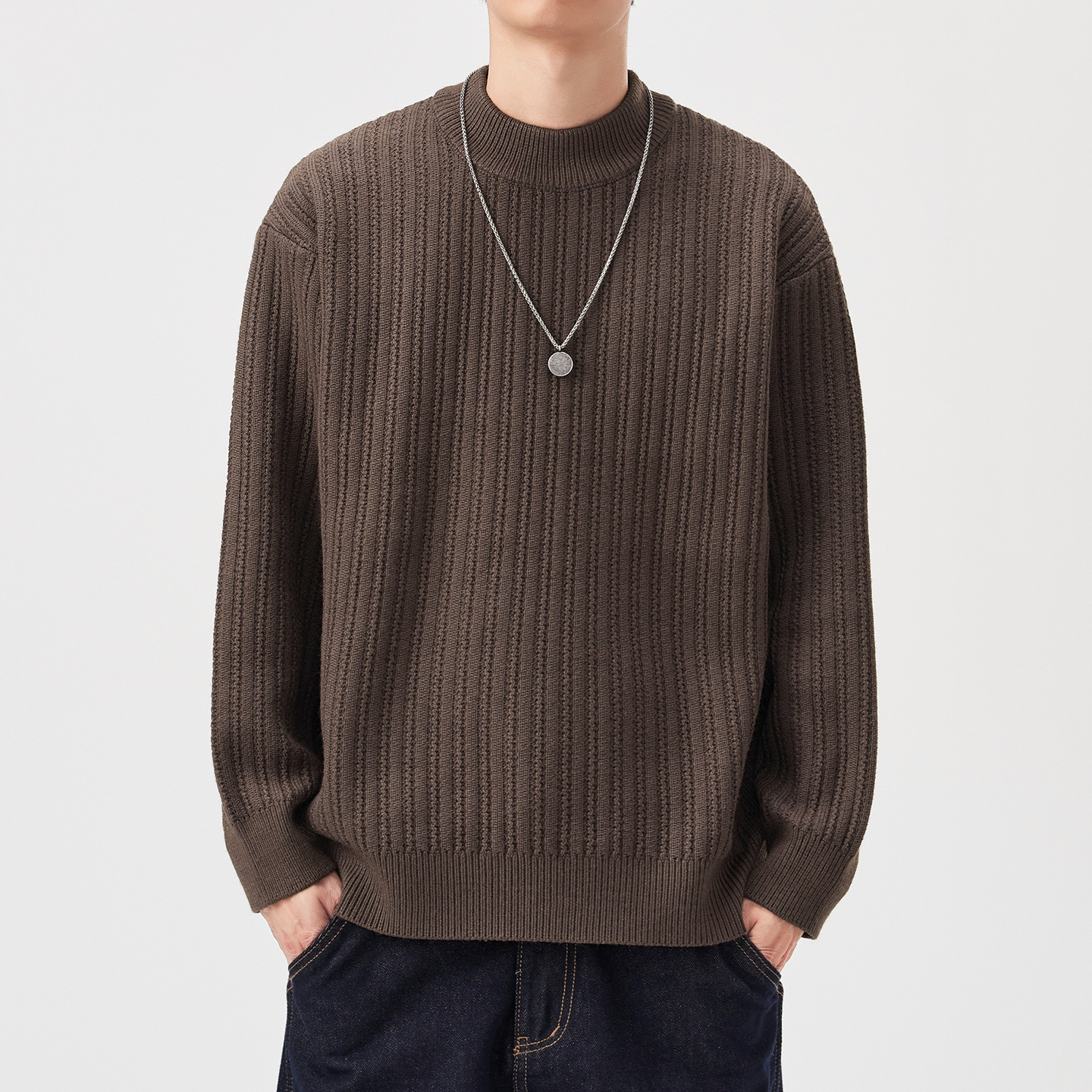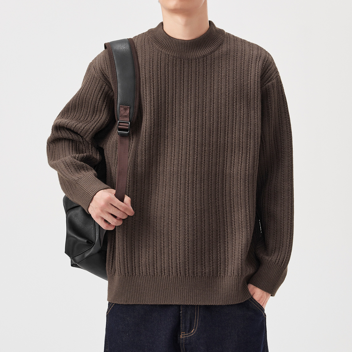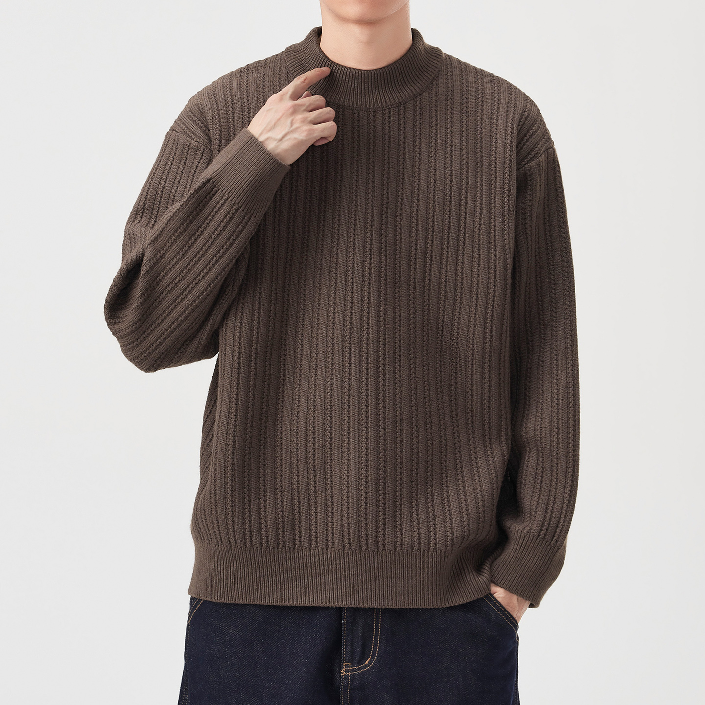 hansca760g重磅半高领纯色毛衣男冬季宽松条纹肌理保暖针织衫外套