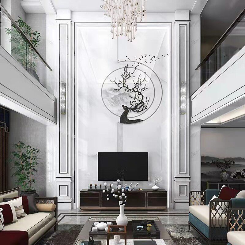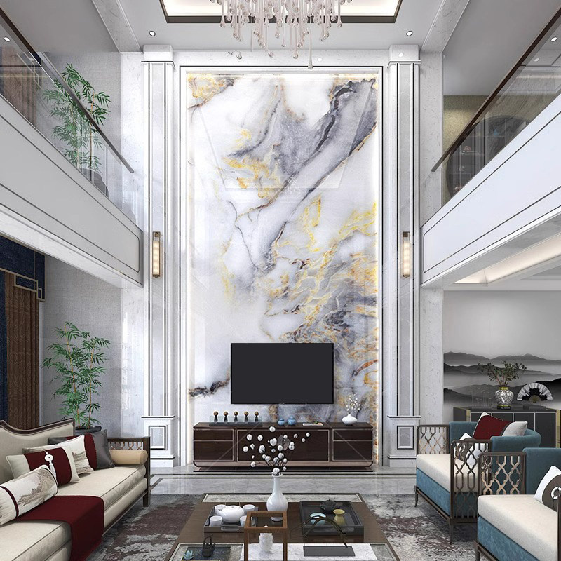 别墅电视背景墙岩板简约大理石纹壁画客厅中空复式楼瓷砖影视壁砖