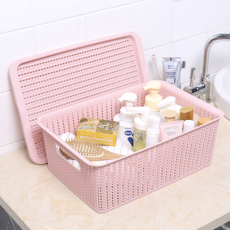仿藤编带盖收纳篮收纳箱塑料筐藤编镂空幼儿园玩具筐 桌面整理盒