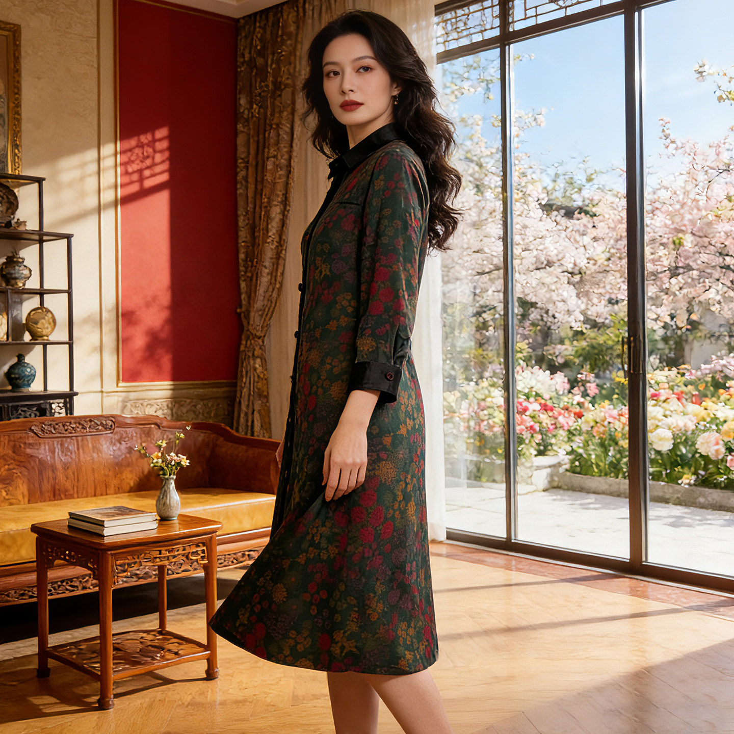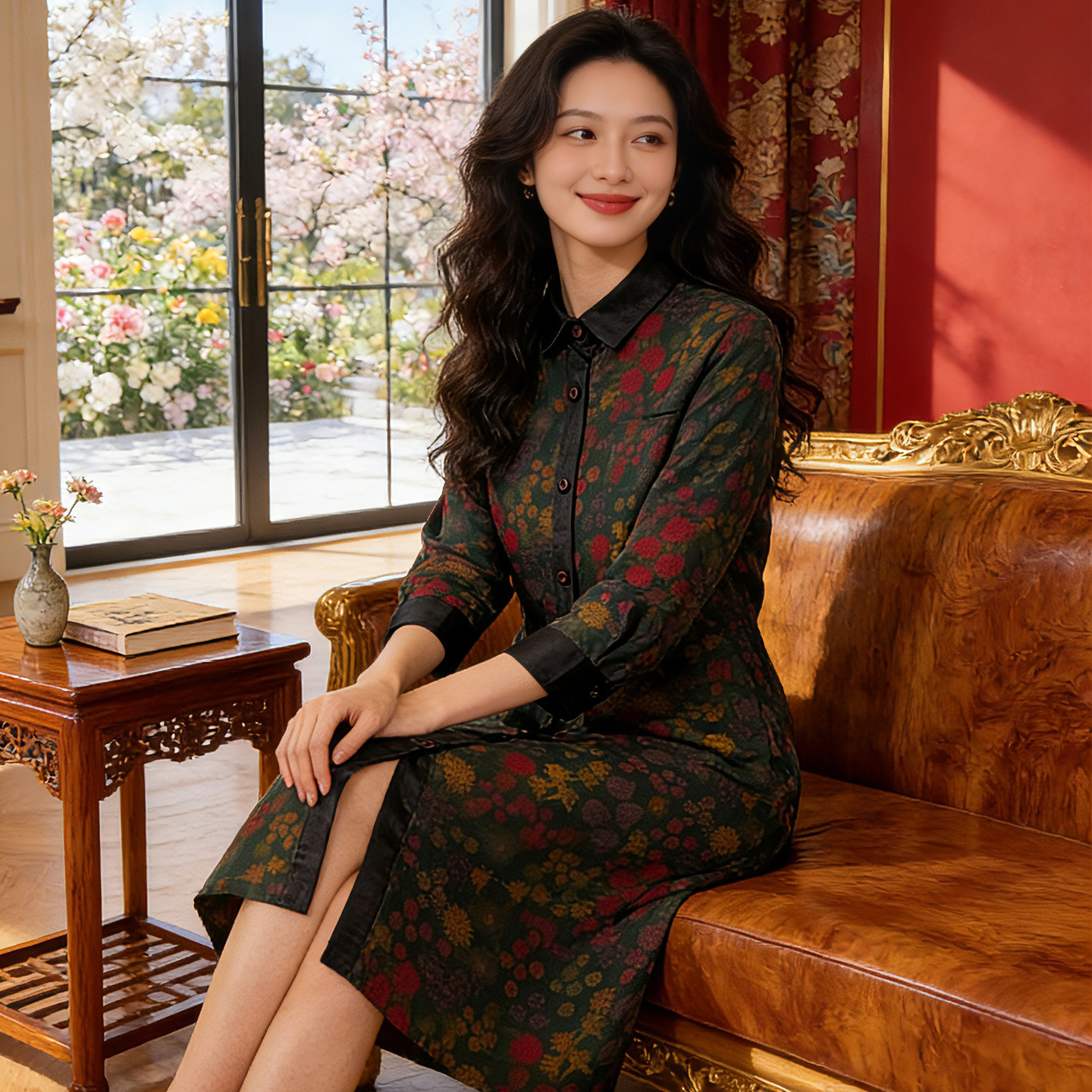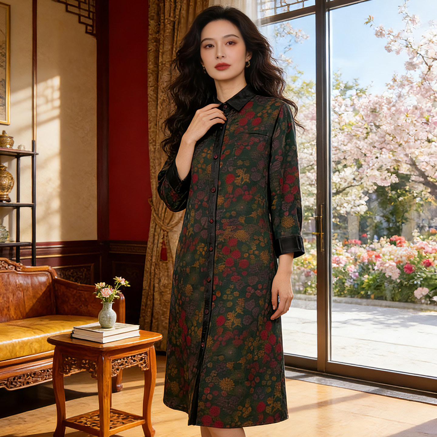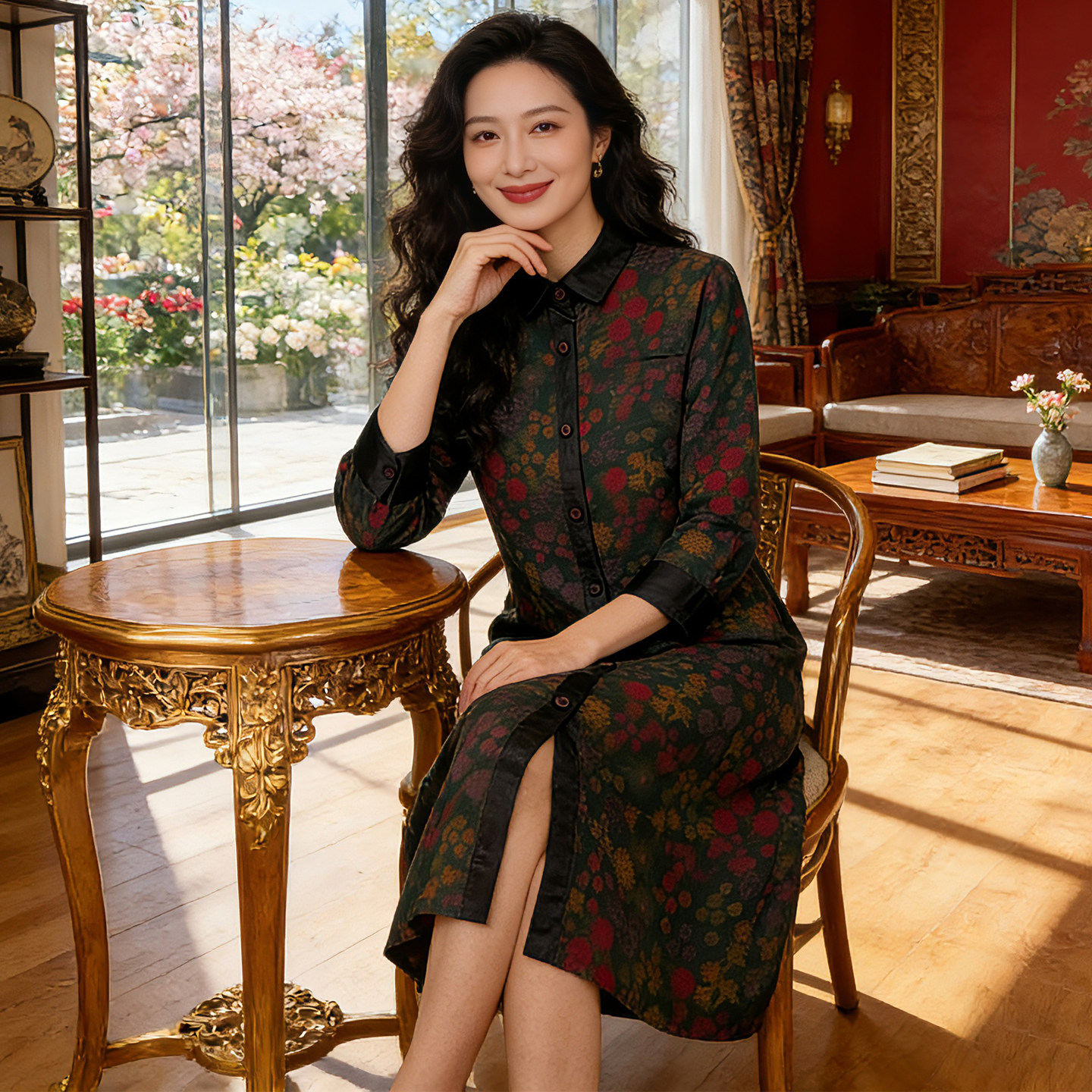 香薇姿碎花桑蚕丝高端衬衫裙长袖