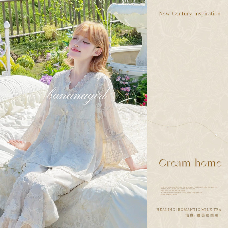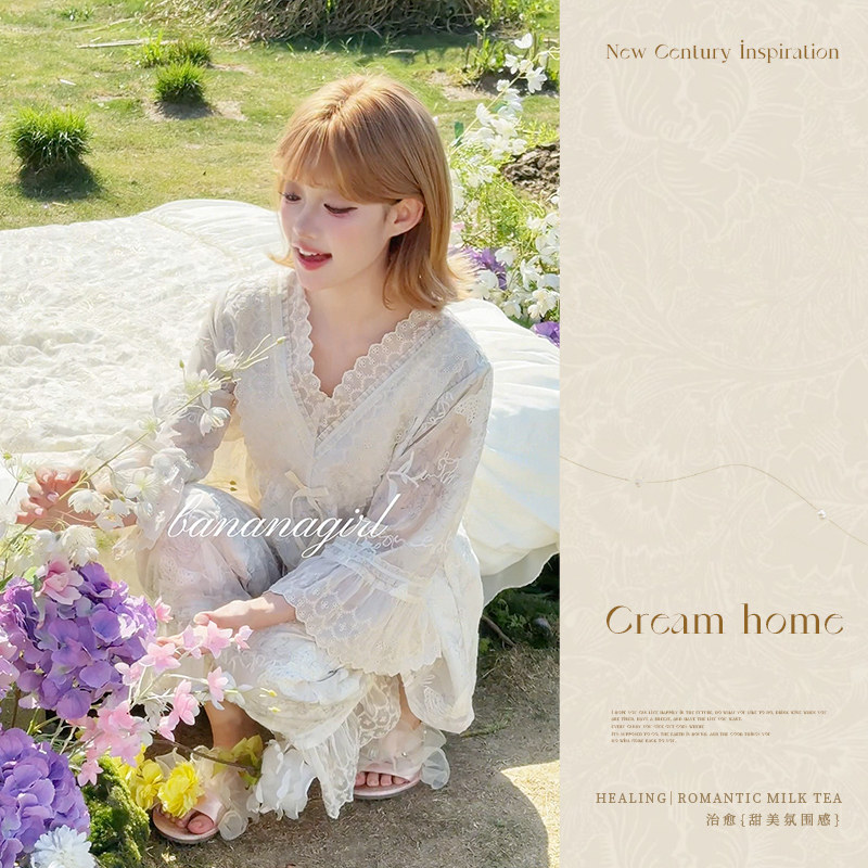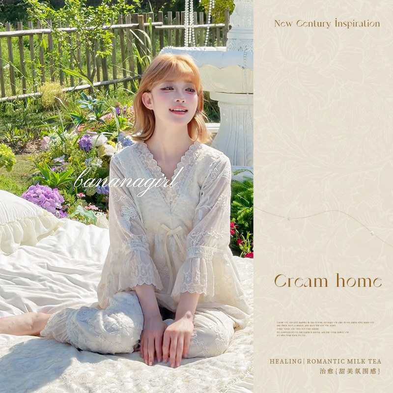 Bananagirl睡衣女款春夏季新款冰丝短裤三件套法式蕾丝风家居服套