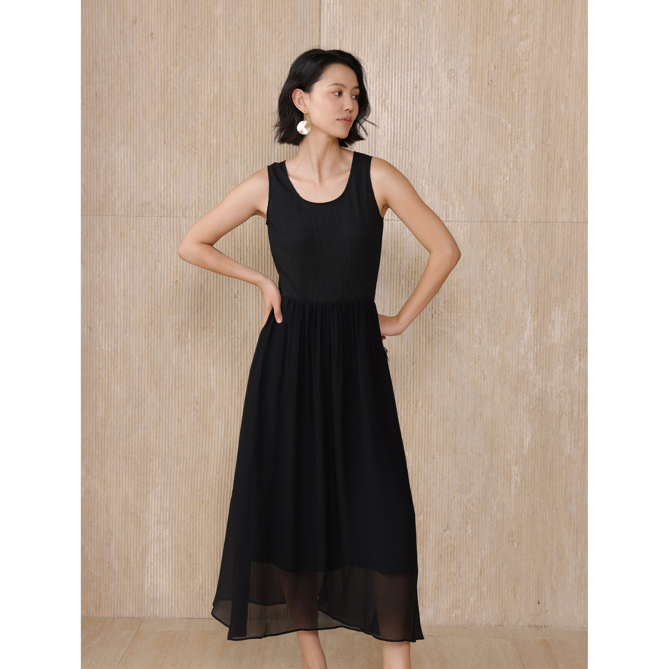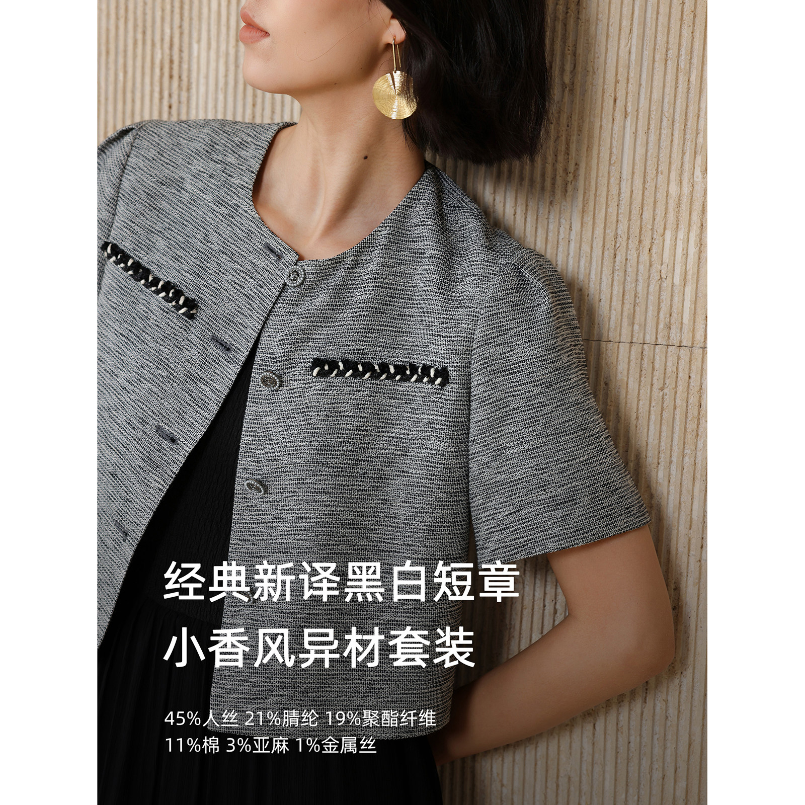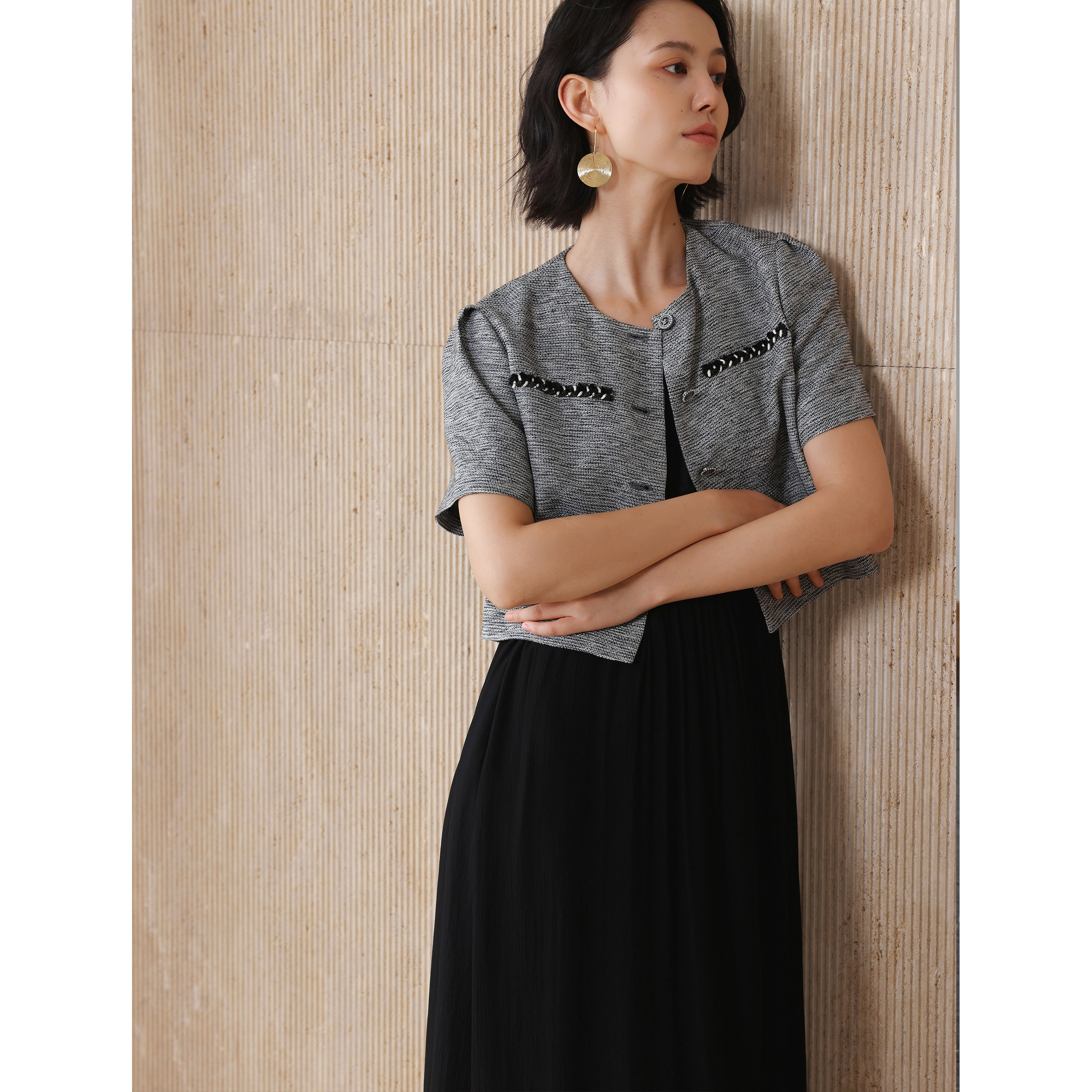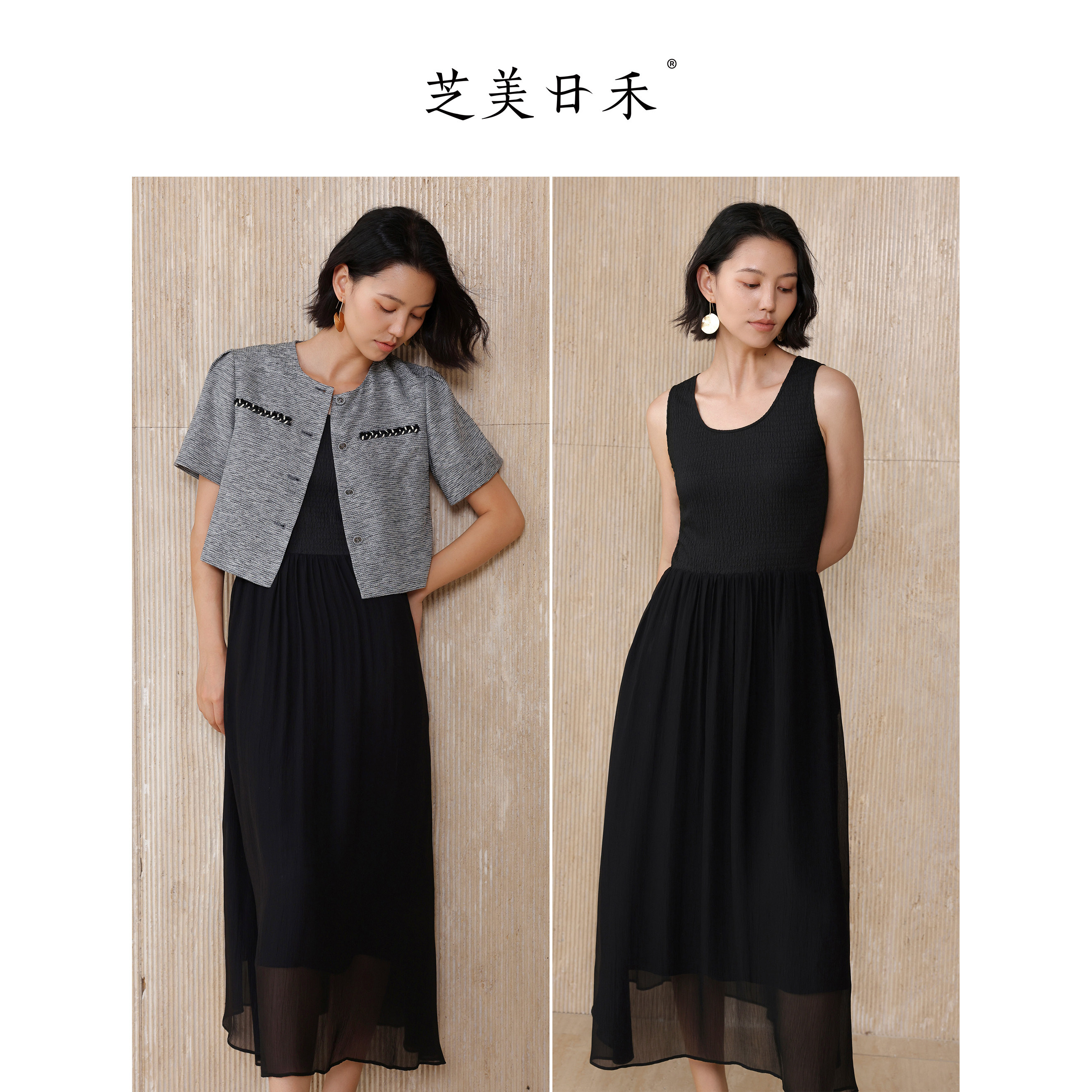 芝美日禾 亚麻人丝小香短外套+U领褶皱背心连衣裙通勤套装