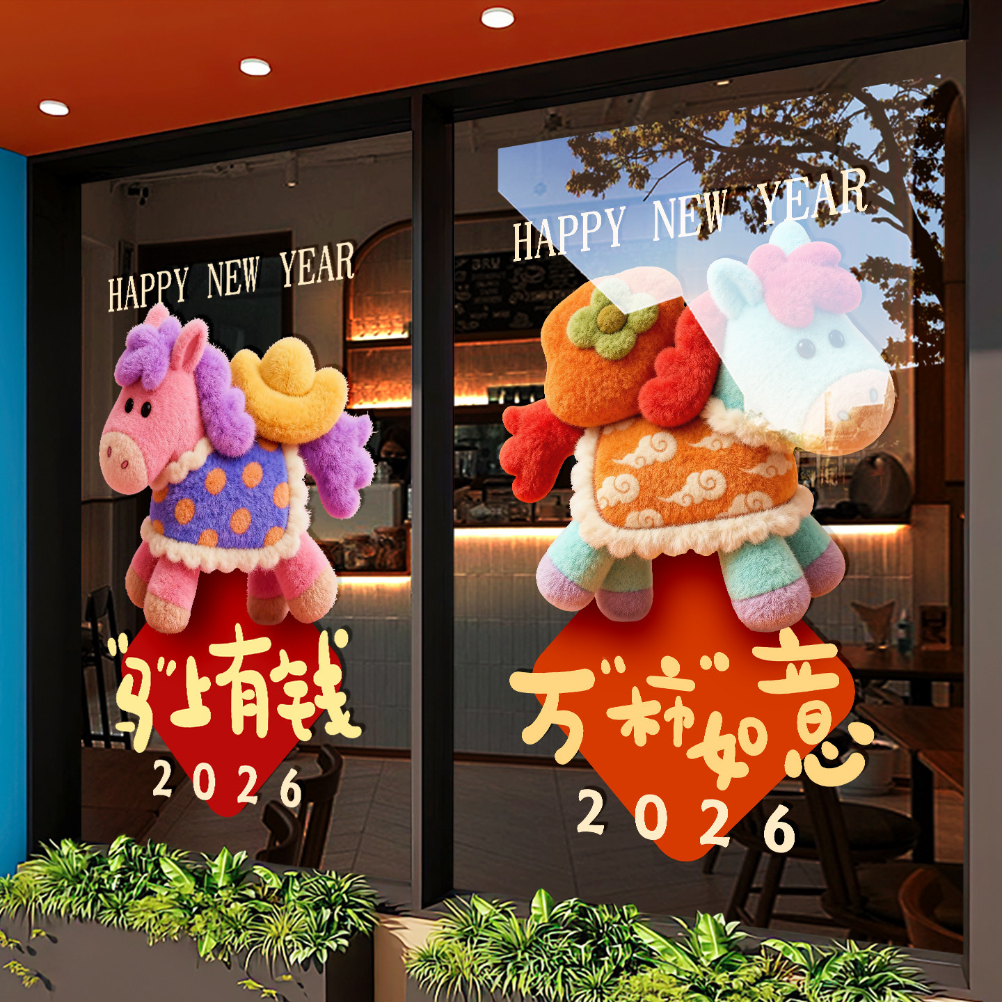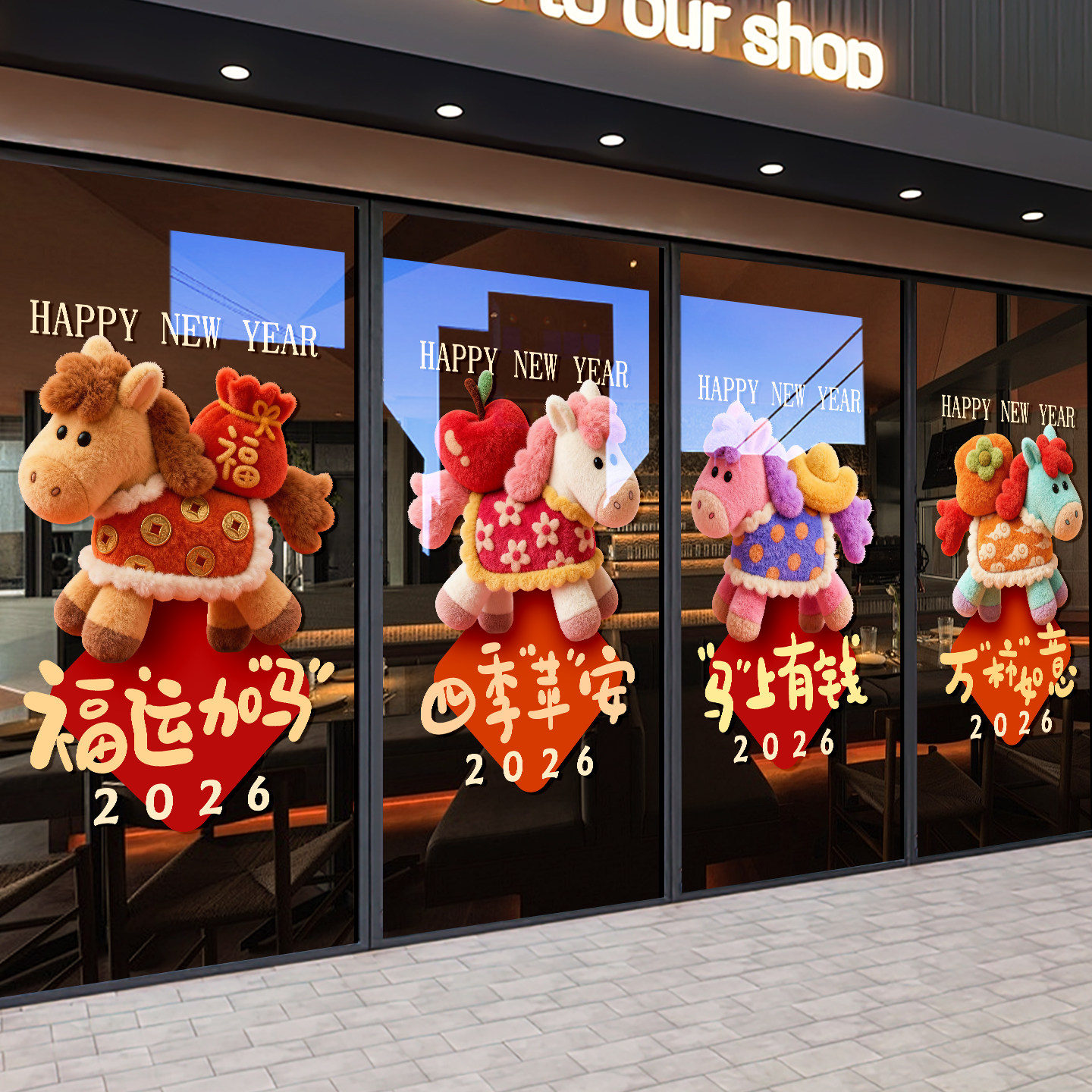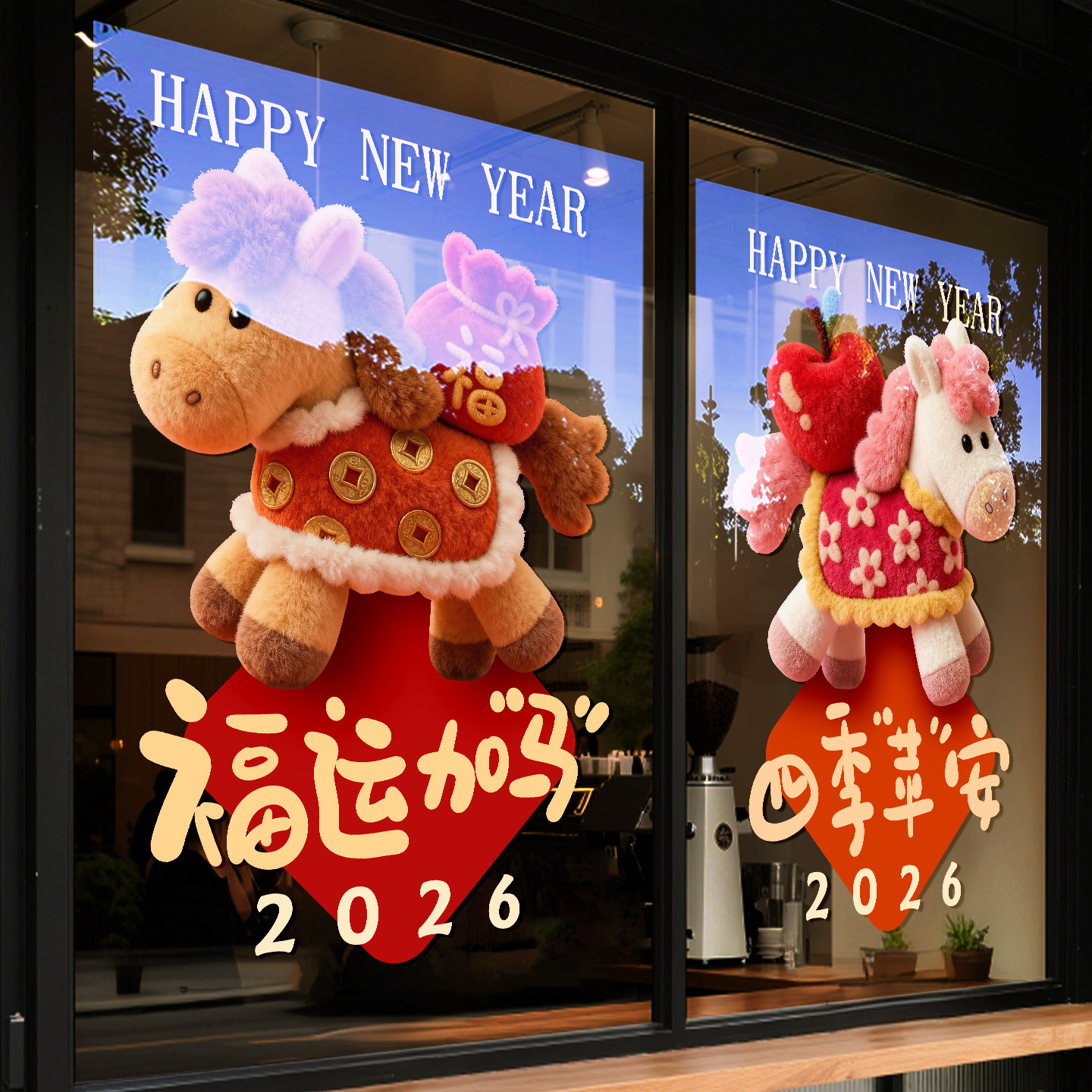 2026新年装饰玻璃门贴纸春节店铺橱窗布置窗花墙贴福运加码静电贴