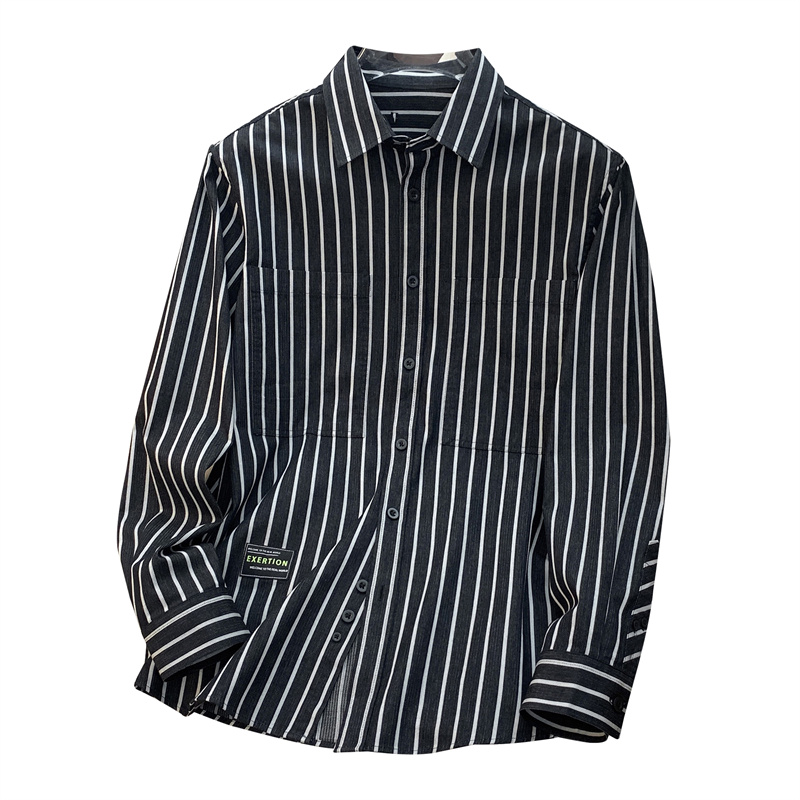 H家、余单!少量现货!100棉黑白条纹长袖衬衫秋季宽松休闲外套男