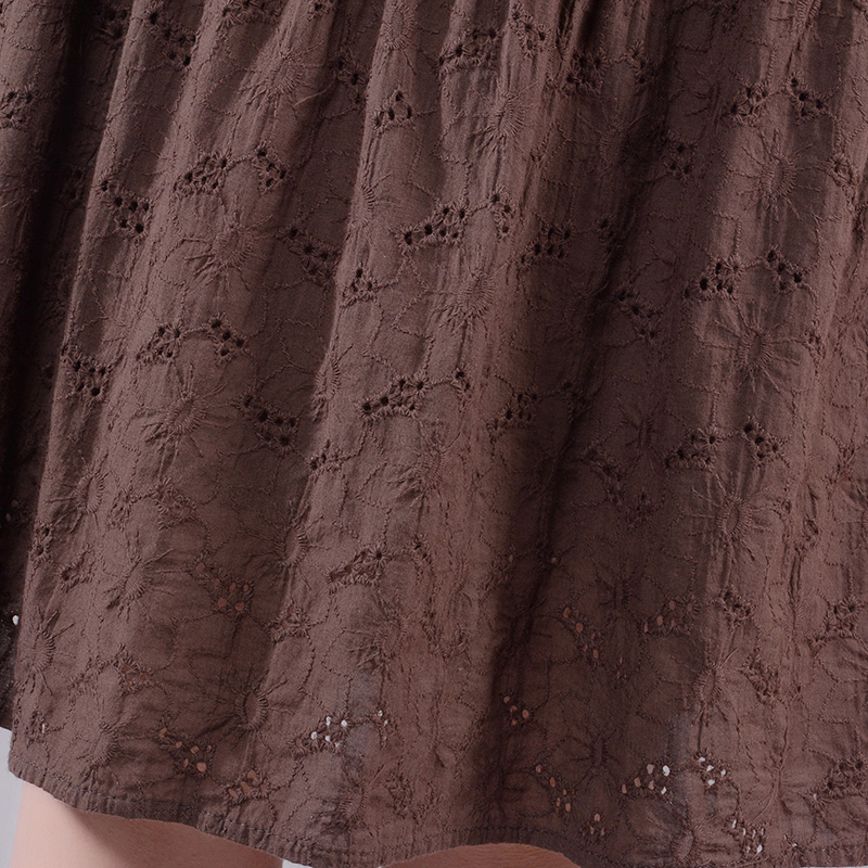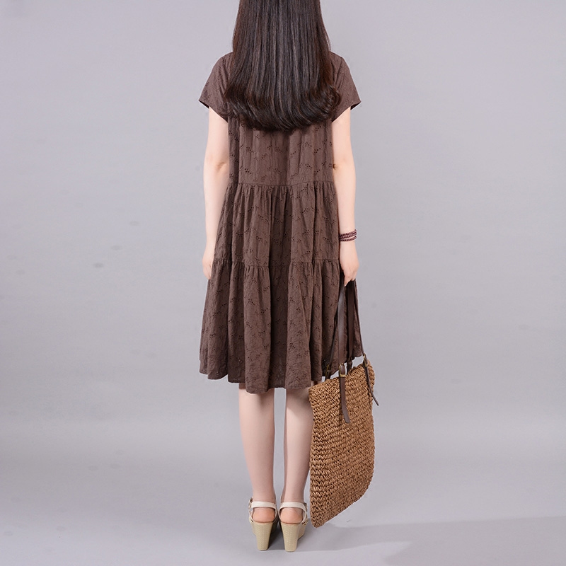 子亦夏装新款大码短袖休闲中长款绣花有内衬镂空棉麻连衣裙