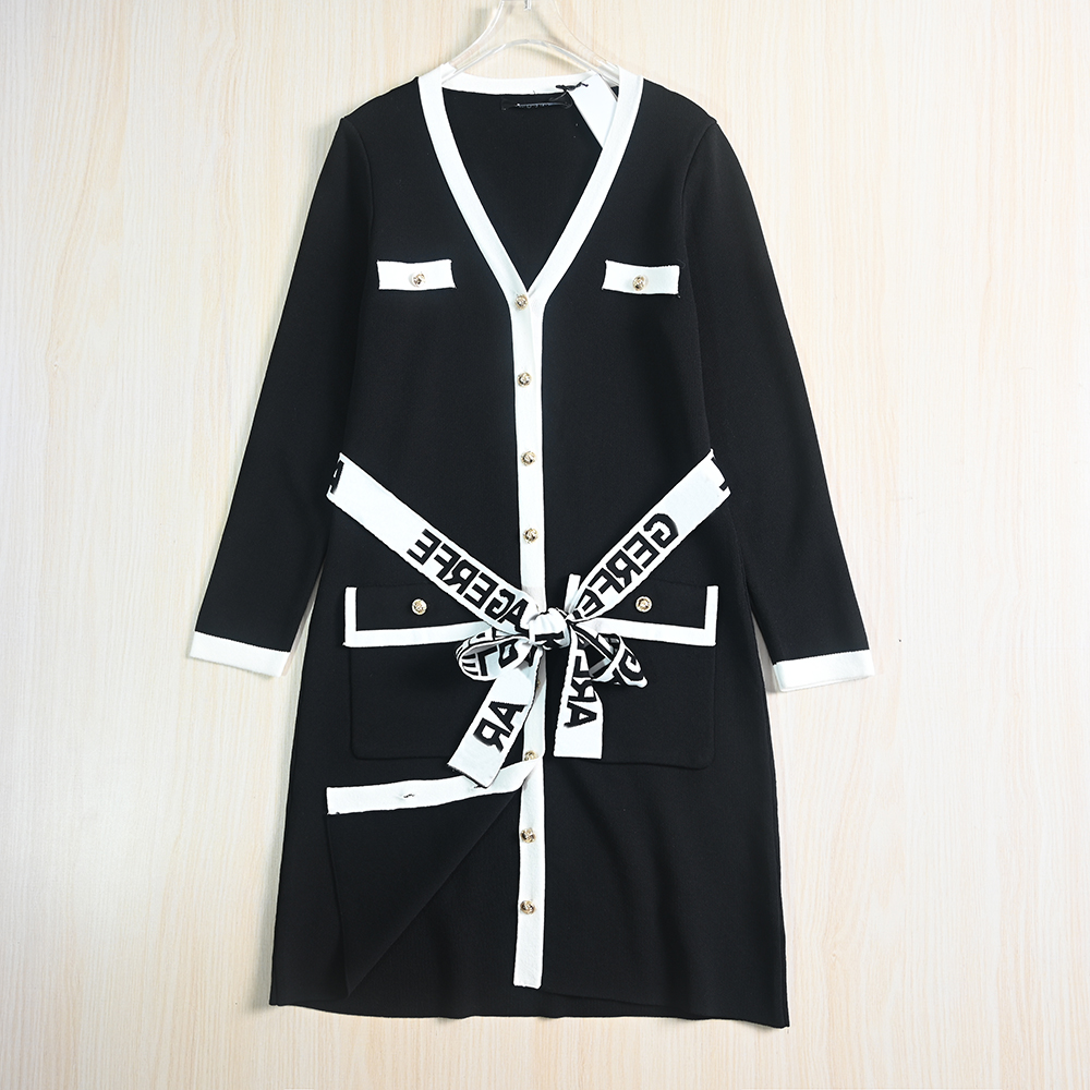 思琪女装 5/30气质时尚V领系扣字母腰带修身九分袖针织连衣裙