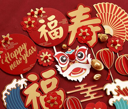 新中式国风蛋糕装饰浪花祥云花朵福寿舞狮灯笼蛋糕插牌甜品台装扮