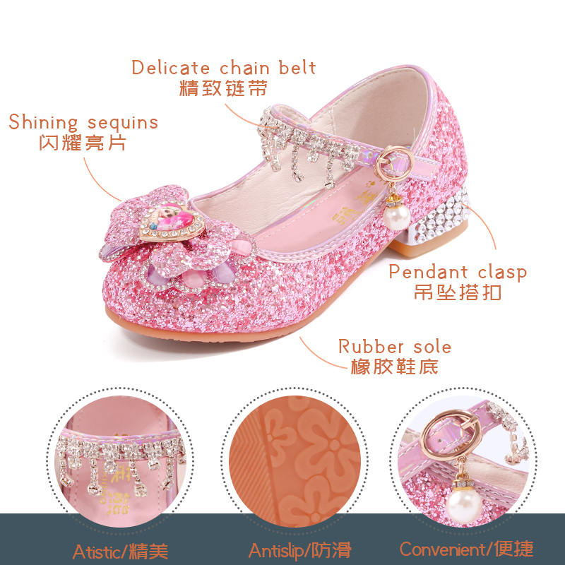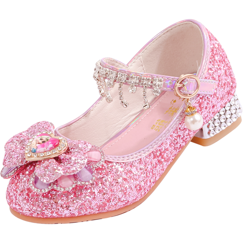 女童皮鞋春秋新款蝴蝶结水晶鞋粉色小女孩高跟鞋儿童爱莎公主单鞋