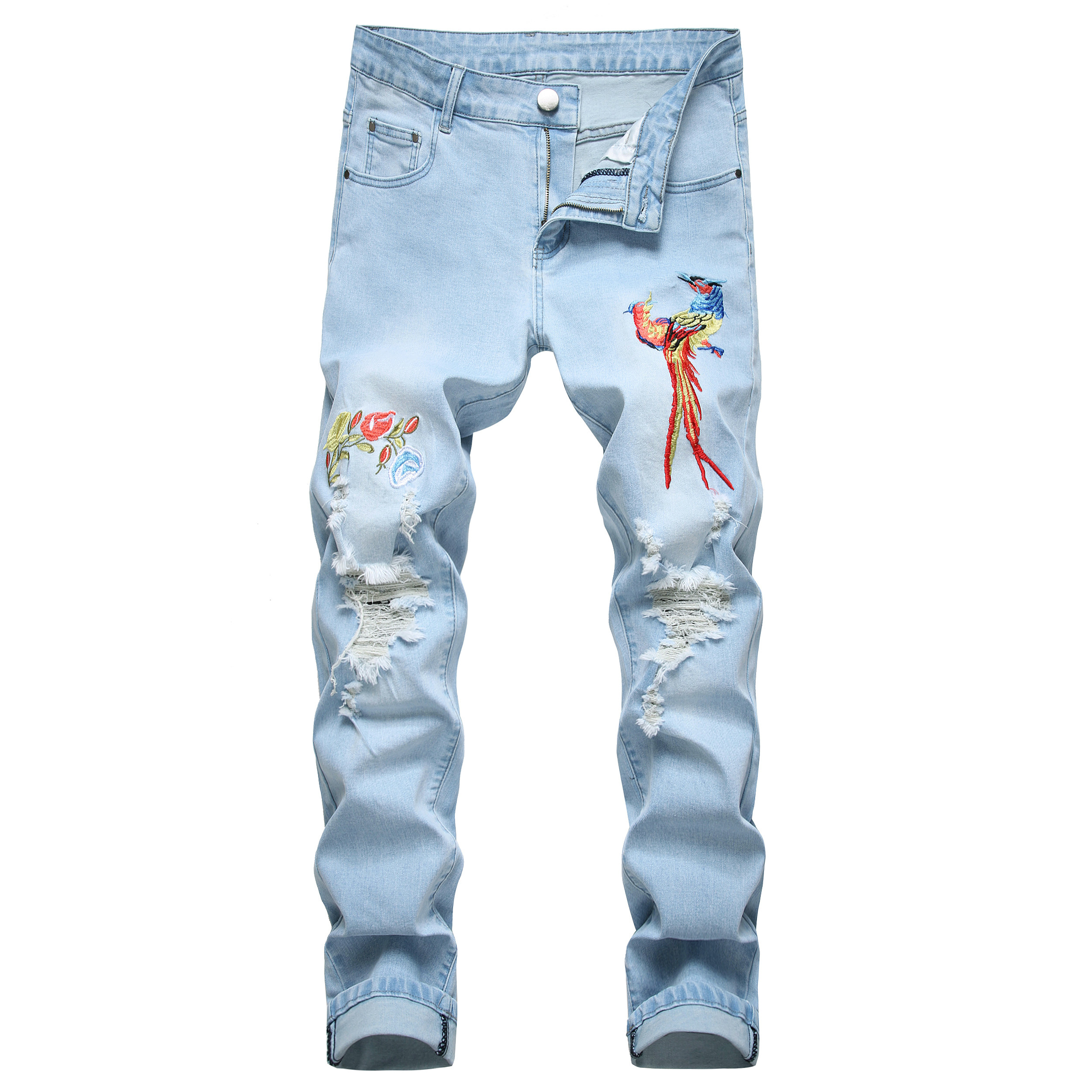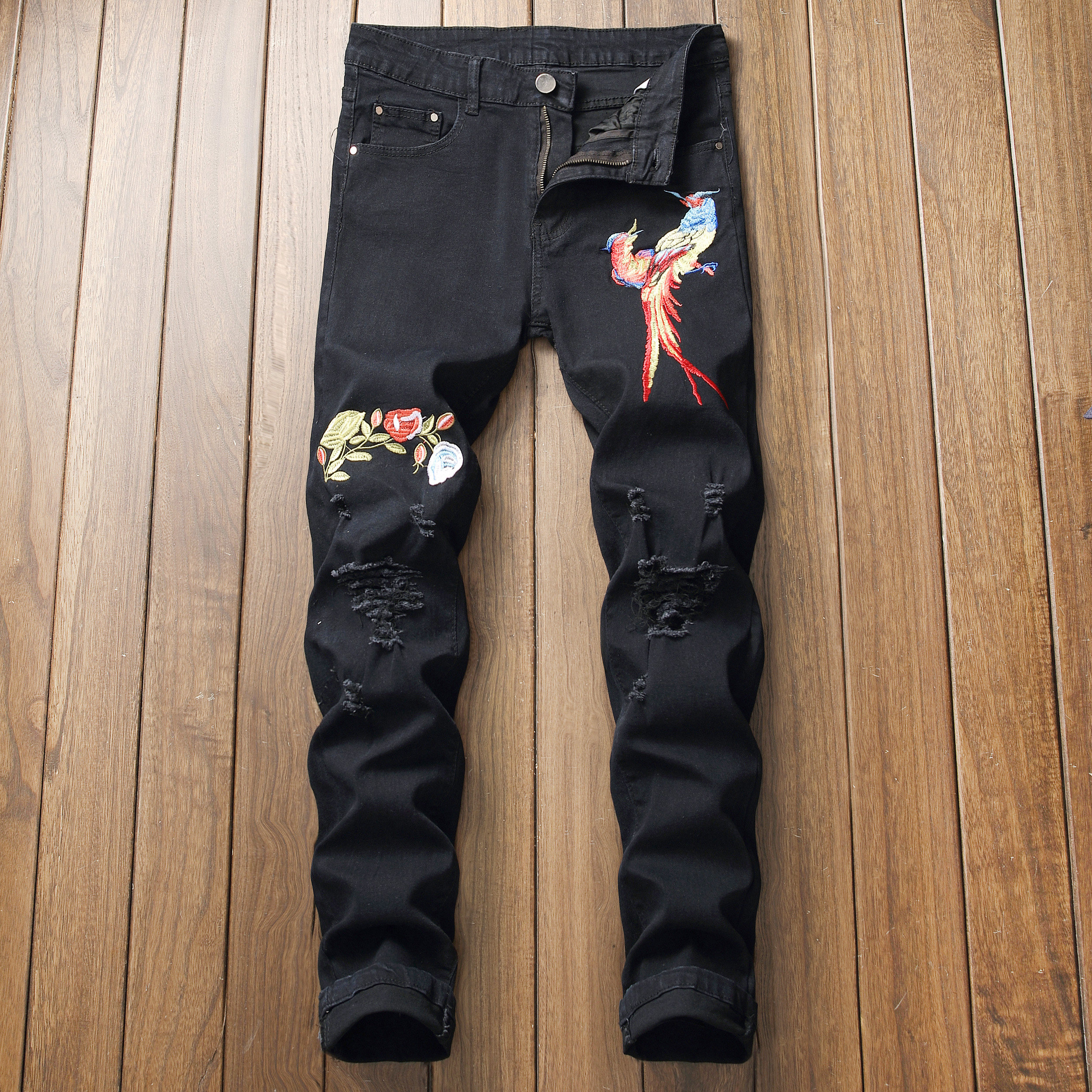 美式高街潮流大破洞修身牛仔裤韩版男士个性剌绣玫瑰花小脚裤弹力