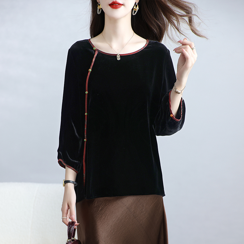 国风真丝丝绒上衣女桑蚕丝圆领九分袖新中式复古休闲妈妈外套春秋