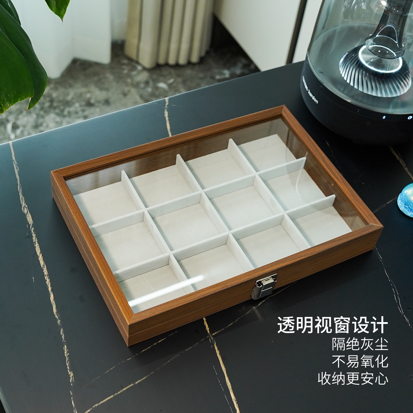 黑胡桃木纹12格首饰收纳盒透明天窗防尘手链手串饰品收藏展示盒子