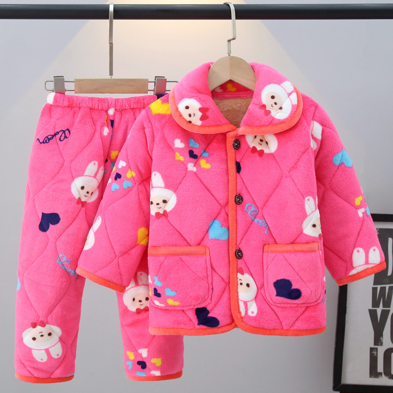 冬季儿童三层夹棉睡衣法兰绒加绒加厚男童奶牛恐龙小熊挖机家居服