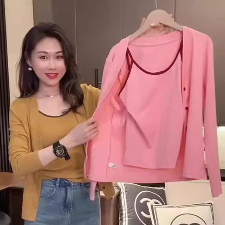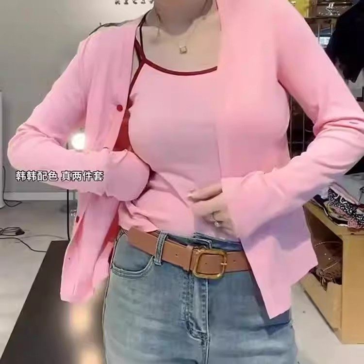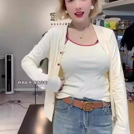 韩版圆领长袖T恤女2026春季修身背心+开衫两件套性感纯欲短款上衣