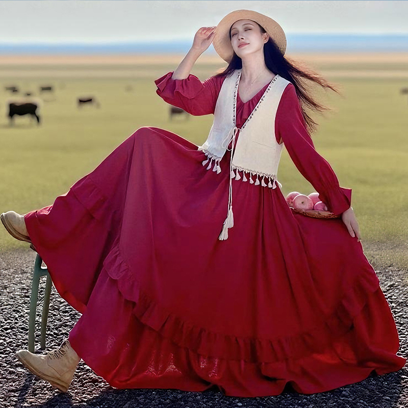 【拾翩】文艺草原旅游度假大裙摆连衣裙女2025秋季红色收腰显瘦裙