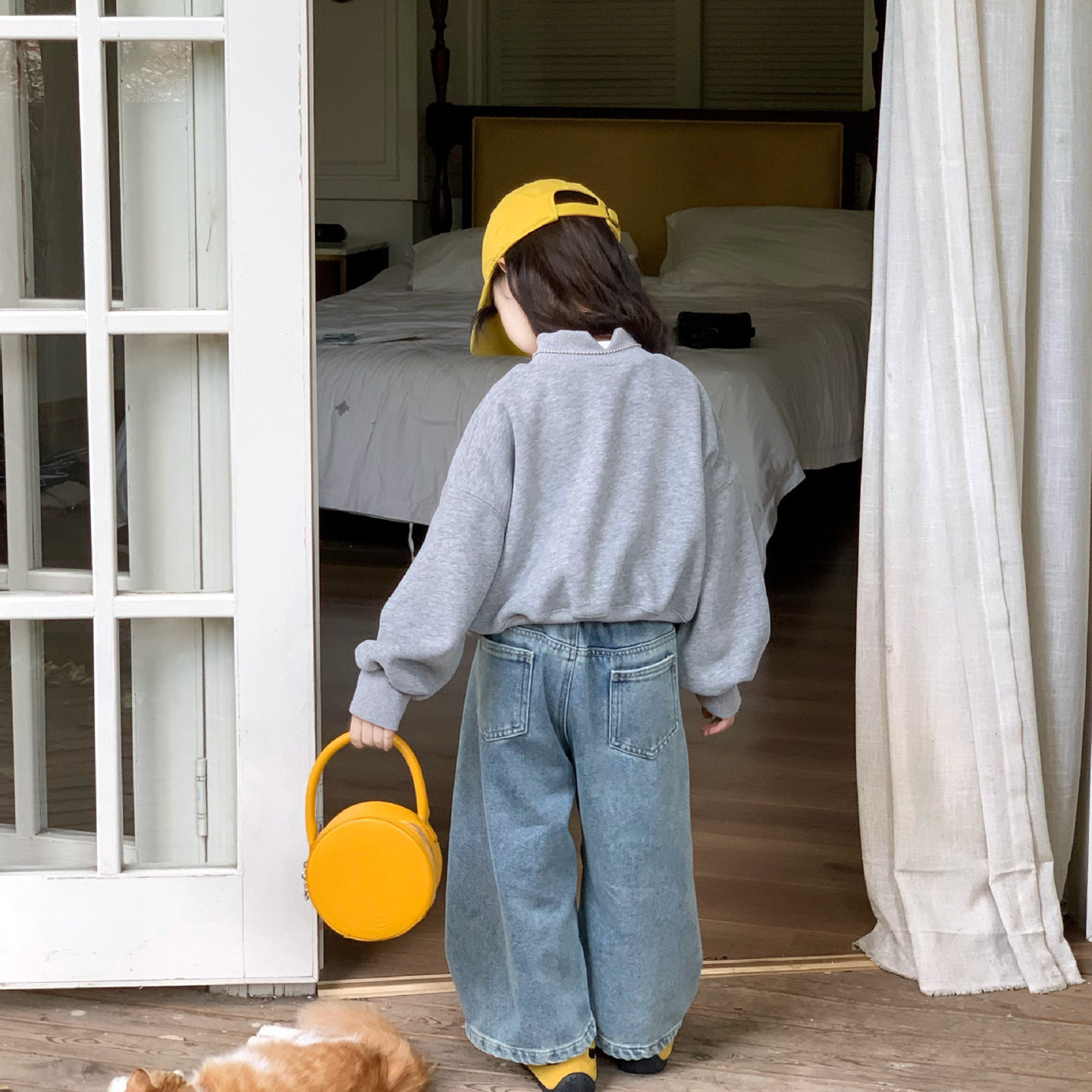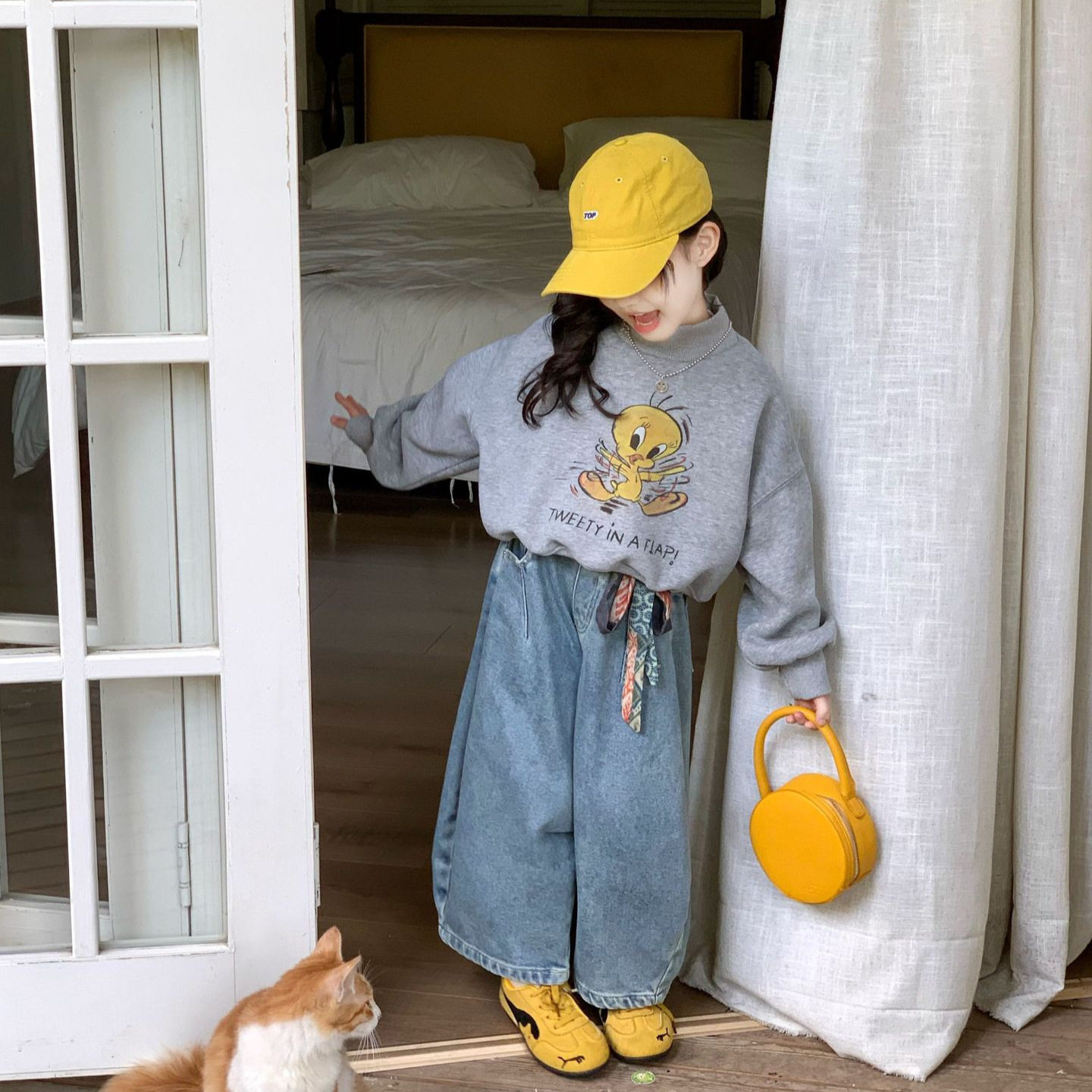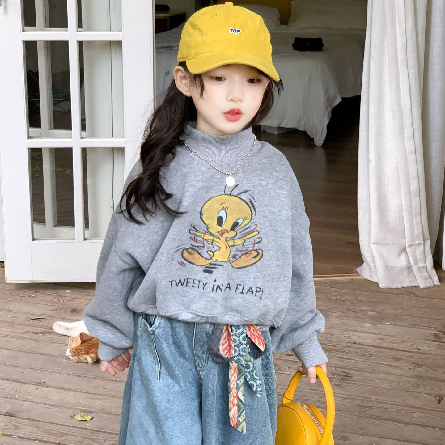 女童卡通印花半高领卫衣2025冬季新款韩版儿童加绒牛仔弯刀裤子潮