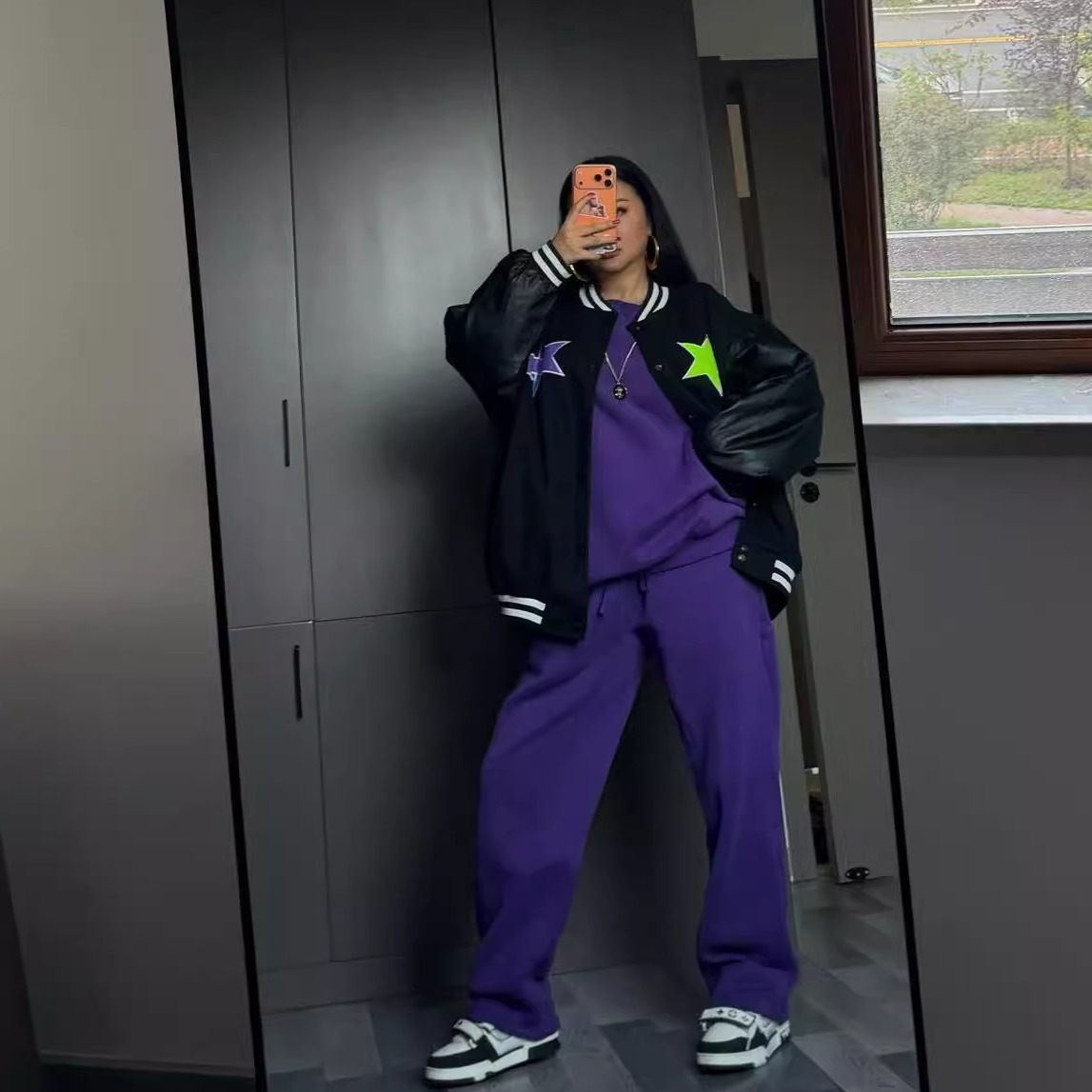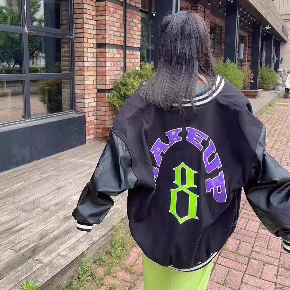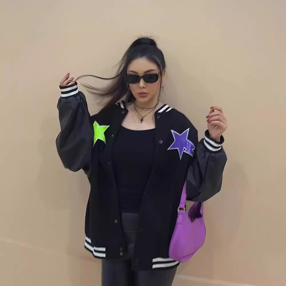 2025秋冬男女毛呢PU欧美式街头嘻哈宽松拼接星星棒球服外套夹克