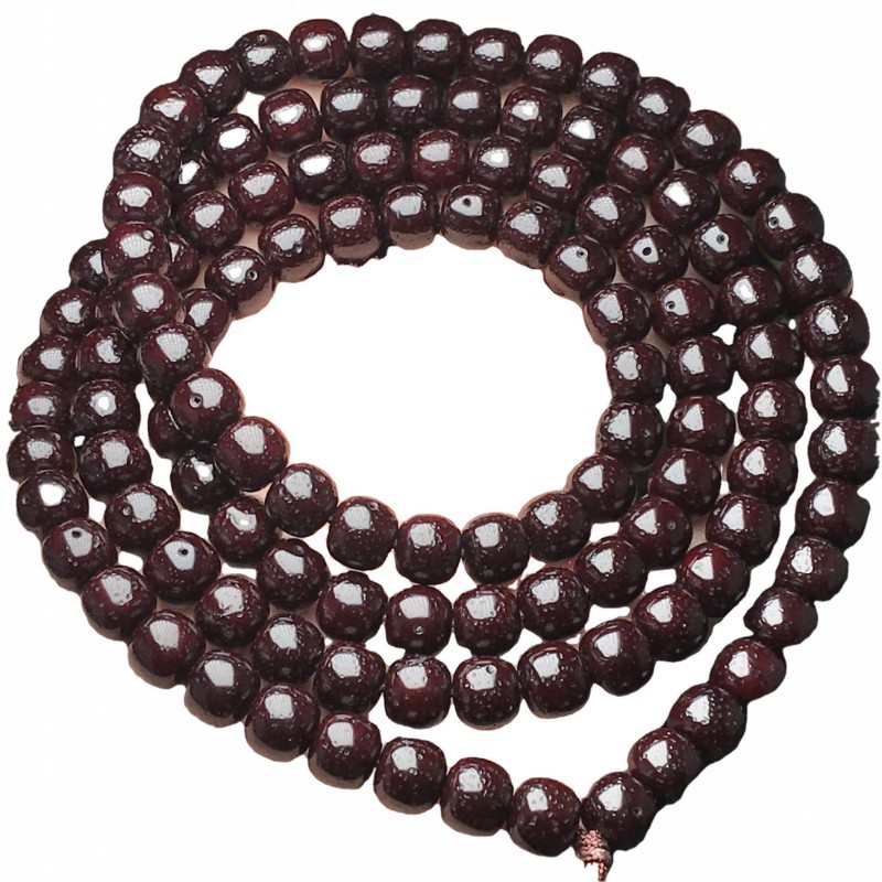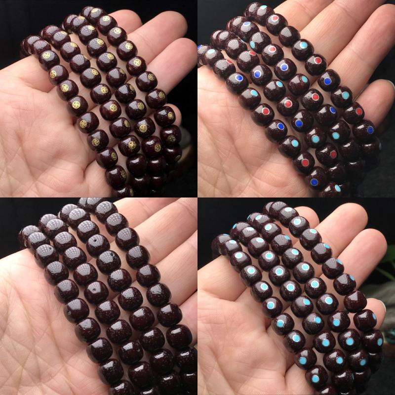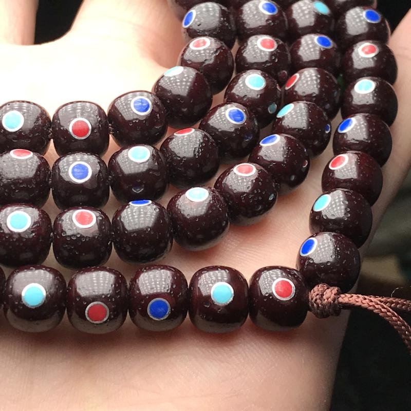 藏传古法朱砂供星月菩提老型桶珠108颗佛珠嵌绿松石多宝万字手串