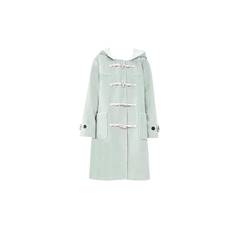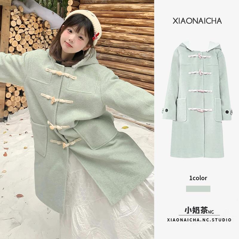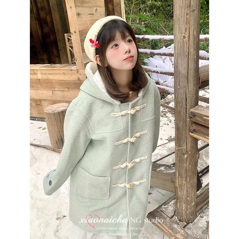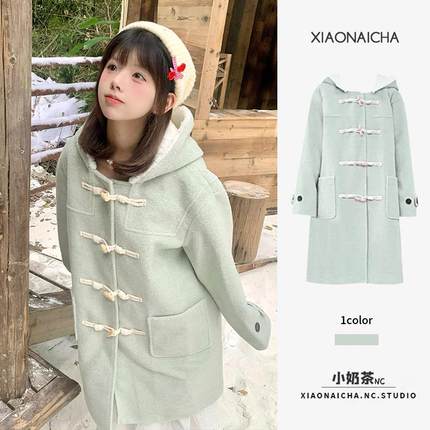 韩系薄荷绿连帽牛角扣毛呢外套女秋冬季小个子中长款加厚呢子大衣