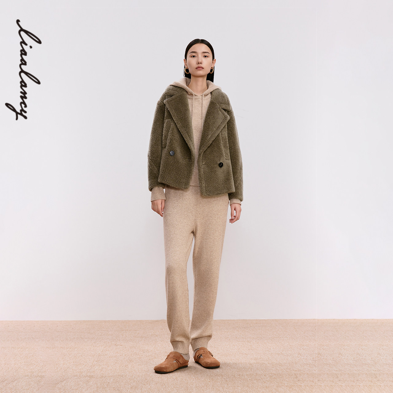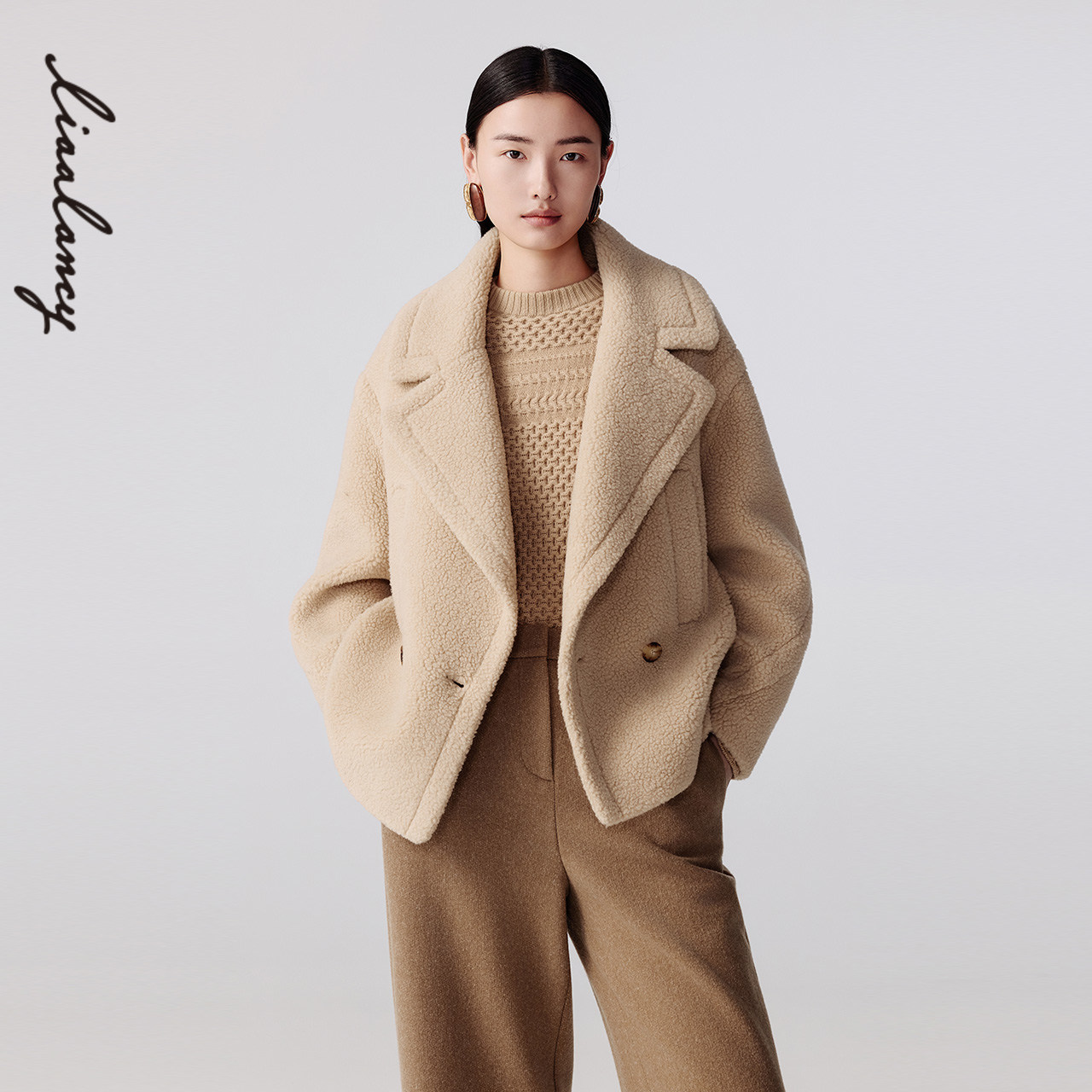 LANCY/朗姿2025冬季新款纯羊毛短款宽松翻领羊剪绒大衣毛呢外套女