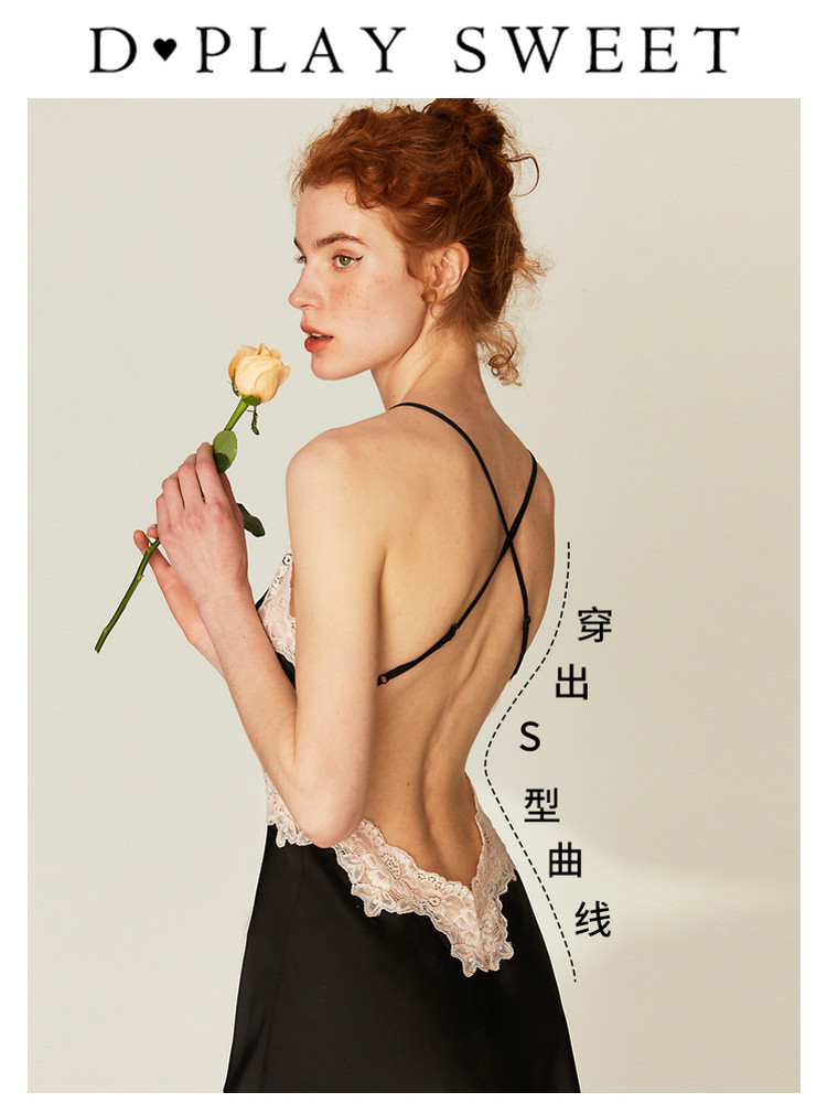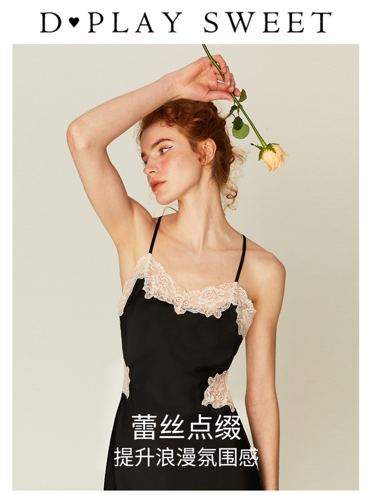 DPLAYSWEET法式黑色性感睡衣美背吊带短裙缎面蕾丝短款女士睡裙