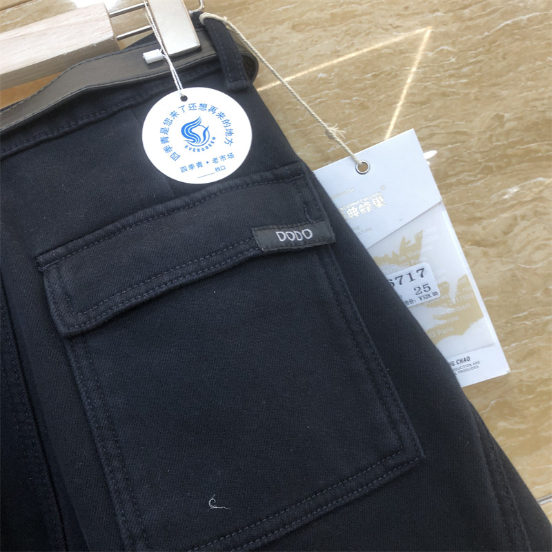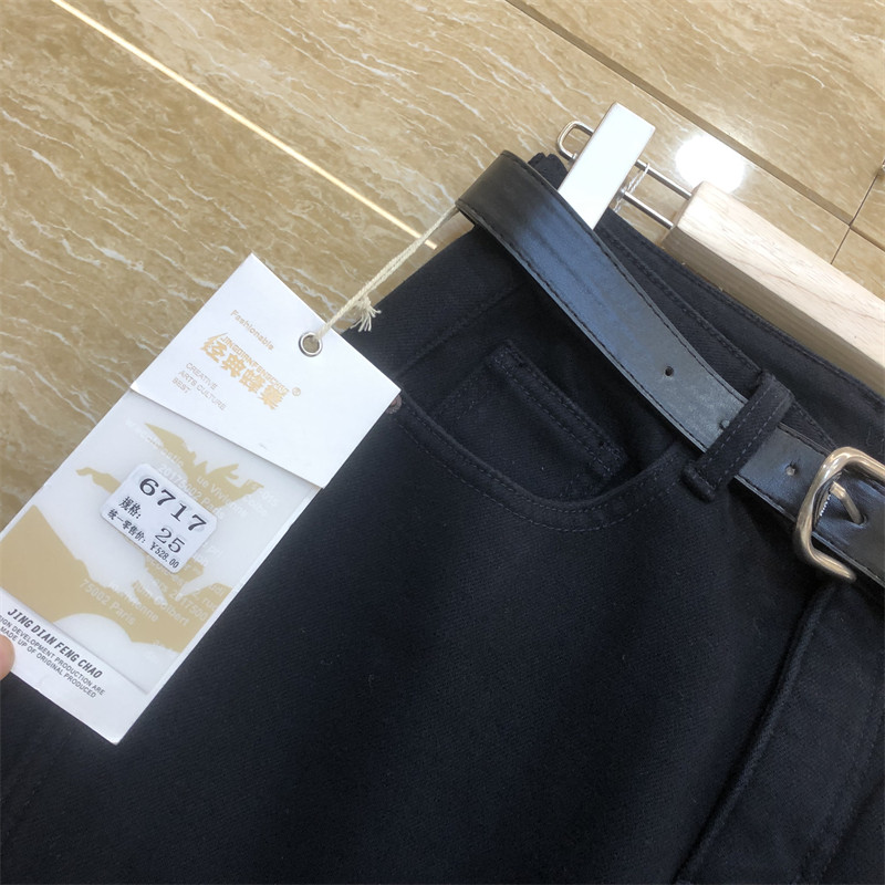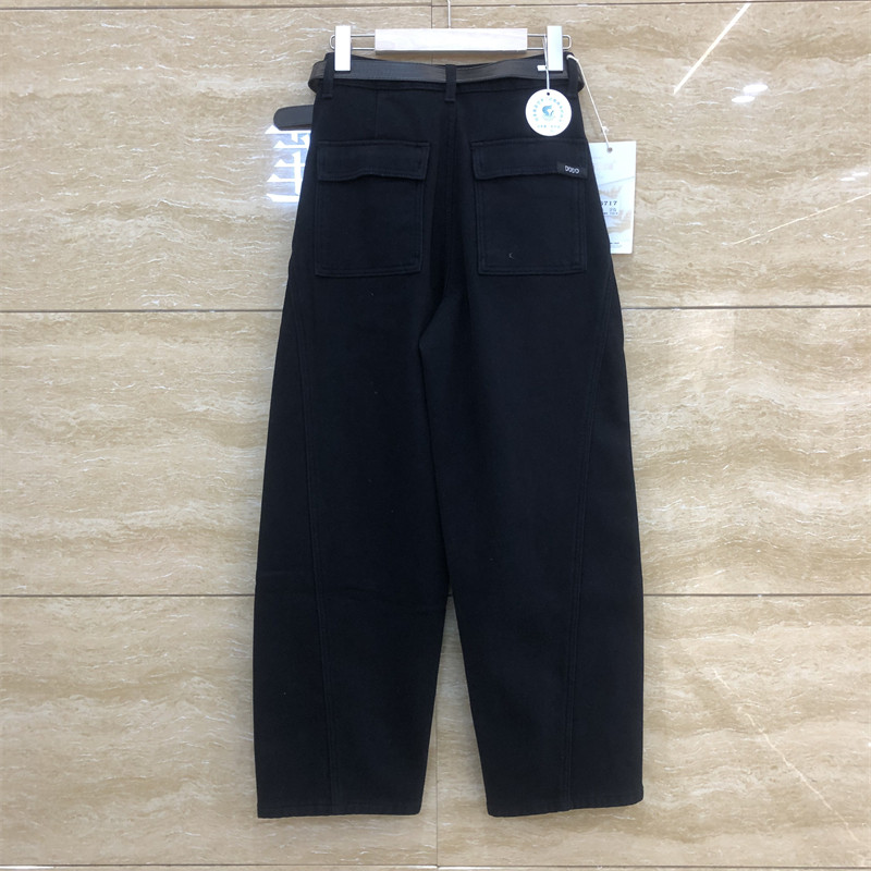 经典蜂巢6717欧洲站藏青色字母刺绣褶皱弯刀腰带宽松加绒牛仔裤女