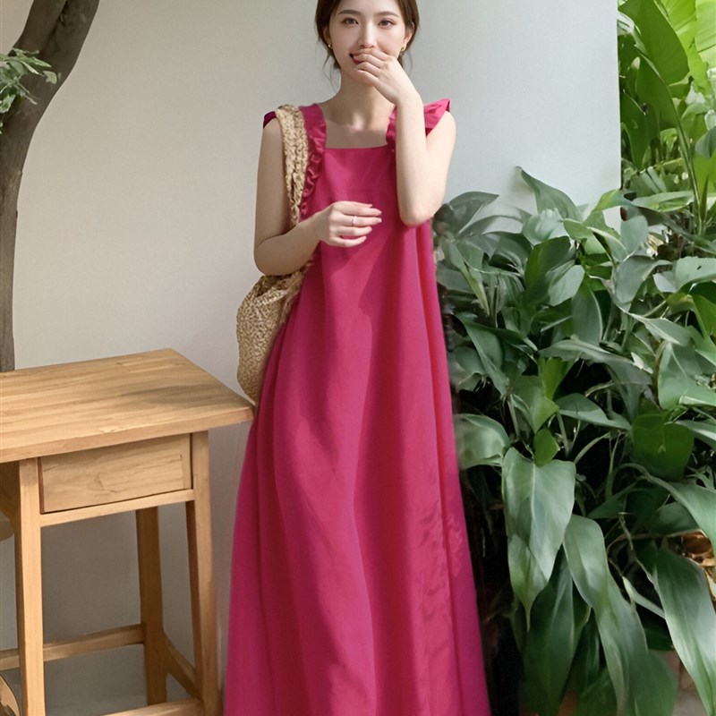 火龙果色无袖背带A字裙夏季2024夏季新款法式方领显瘦连衣裙1455