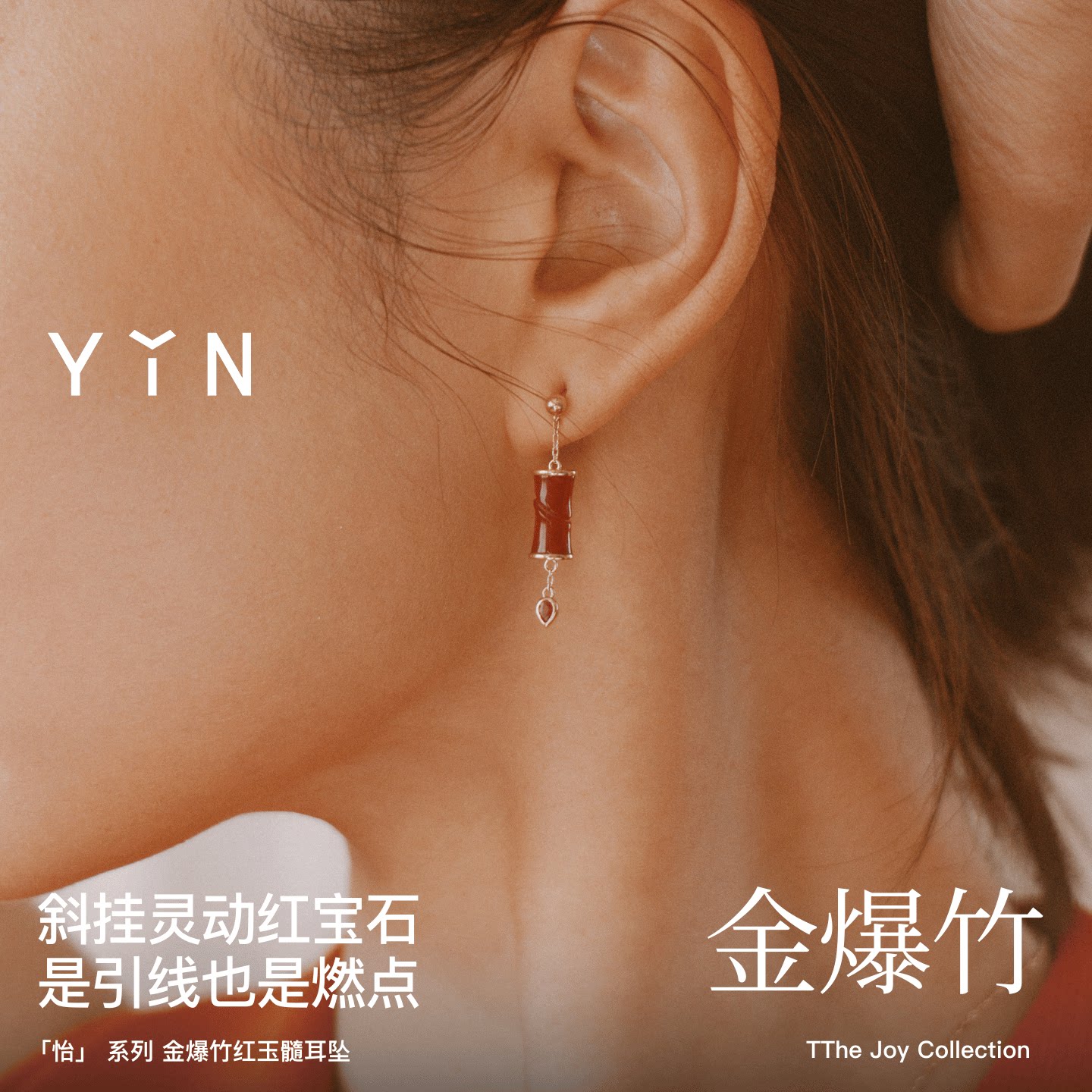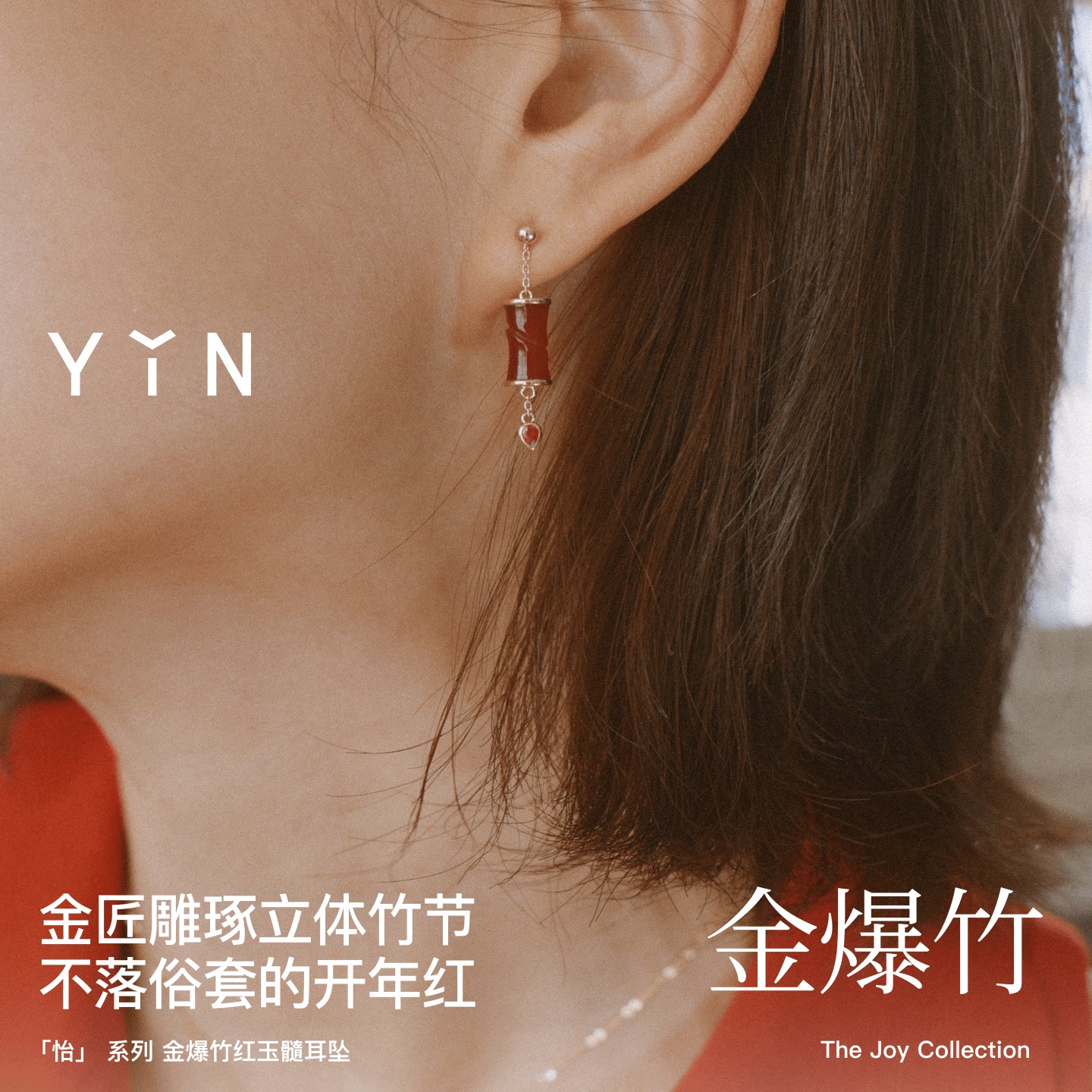 「怡」金爆竹红玉髓18K金耳饰竹节耳坠中式祝福新年情人节礼物