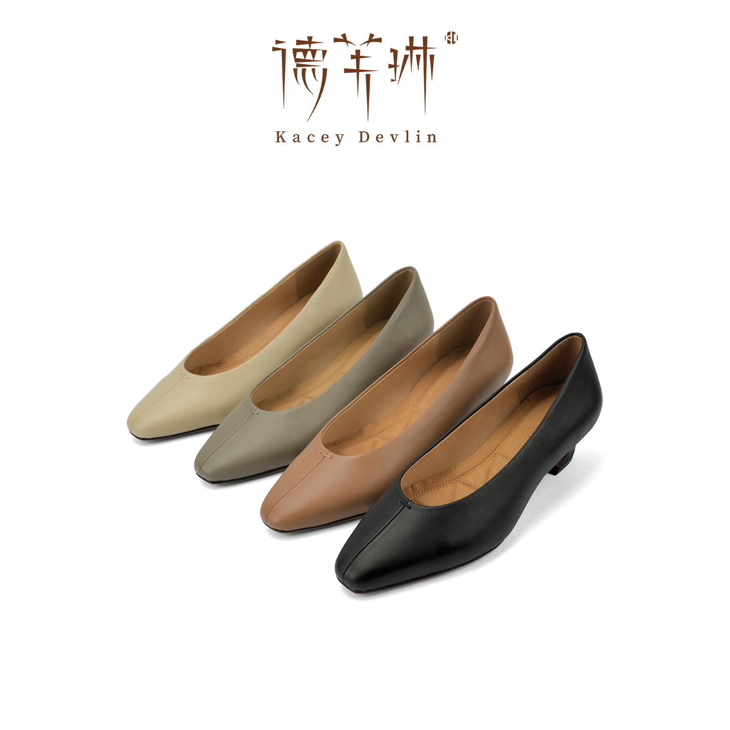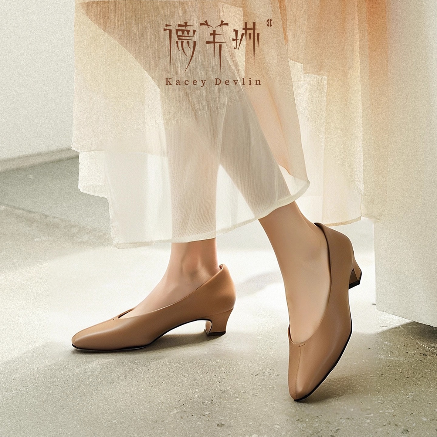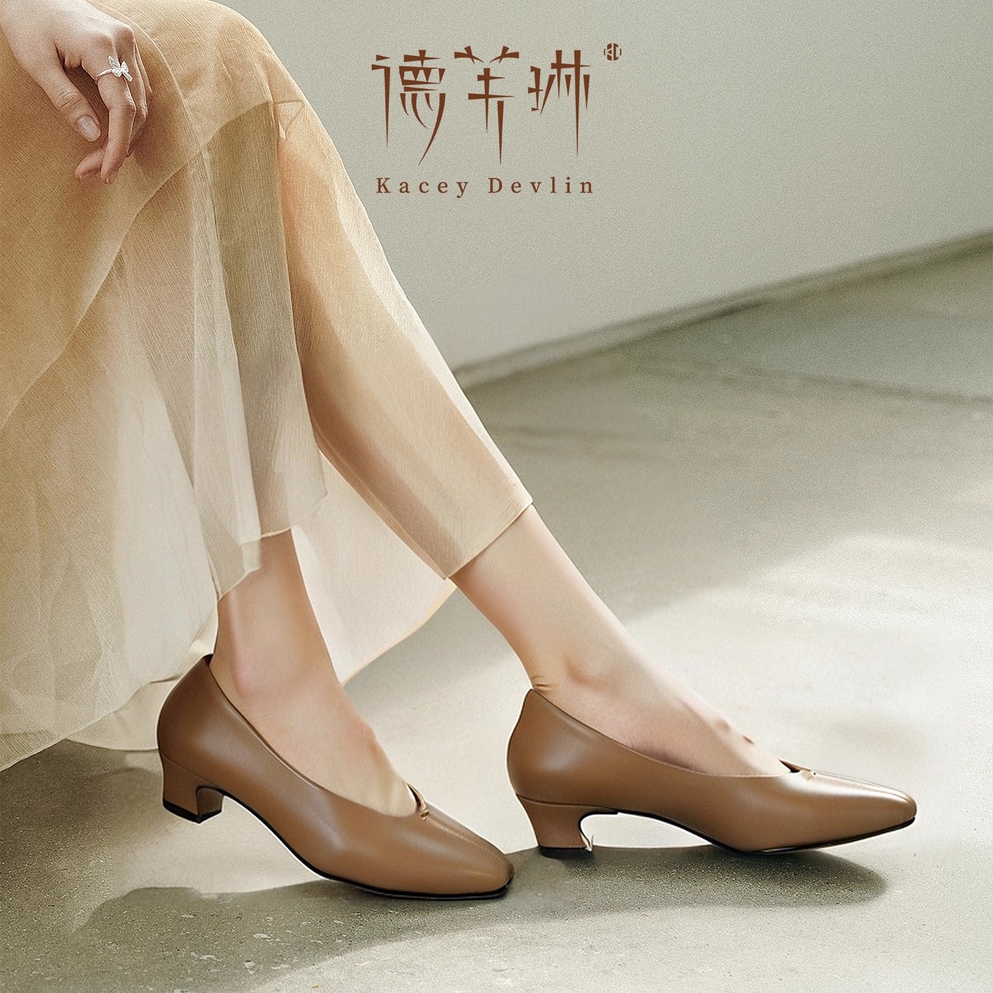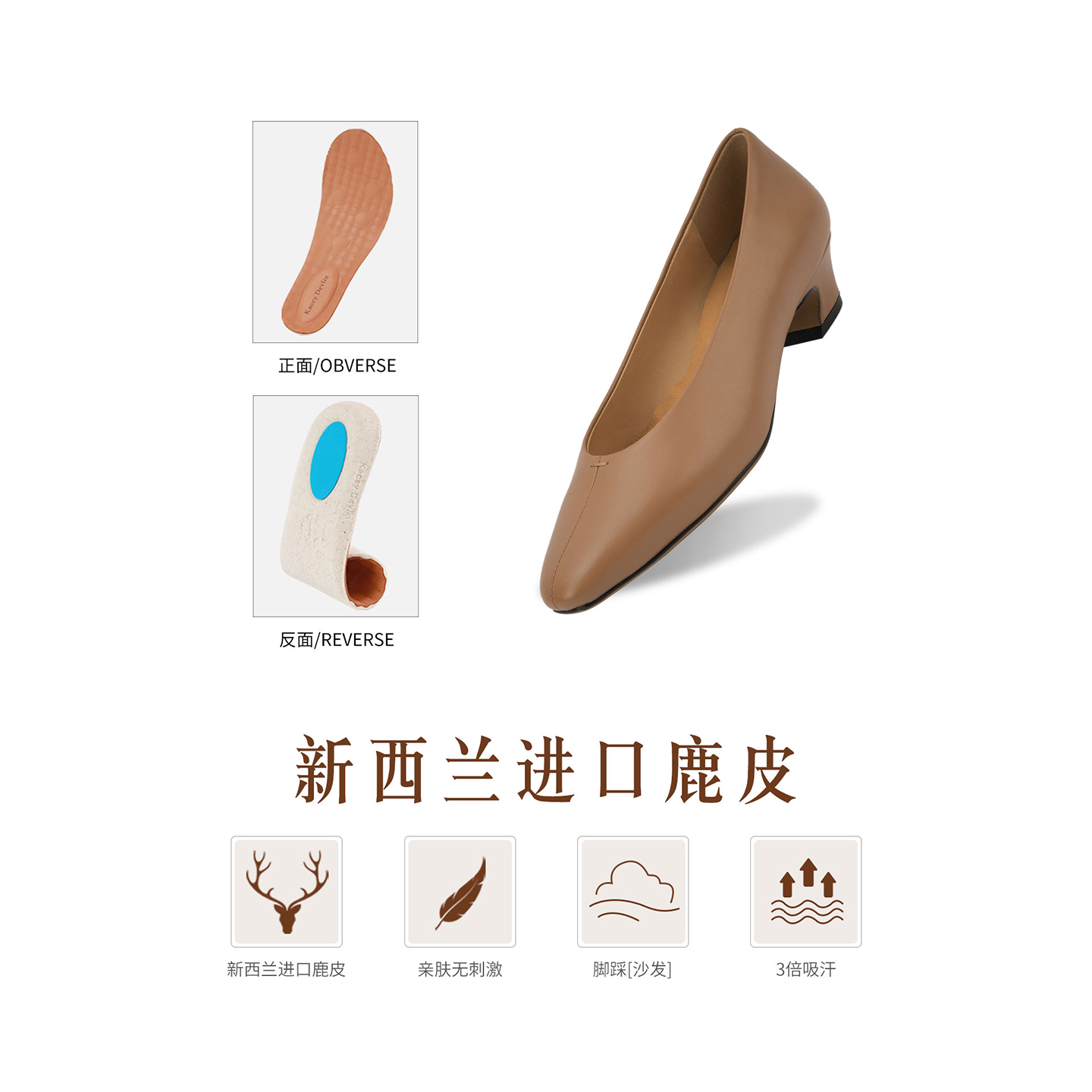德芙琳鹿皮中跟奶奶鞋女棕色通勤粗跟羊皮软底浅口单鞋4CM工作鞋