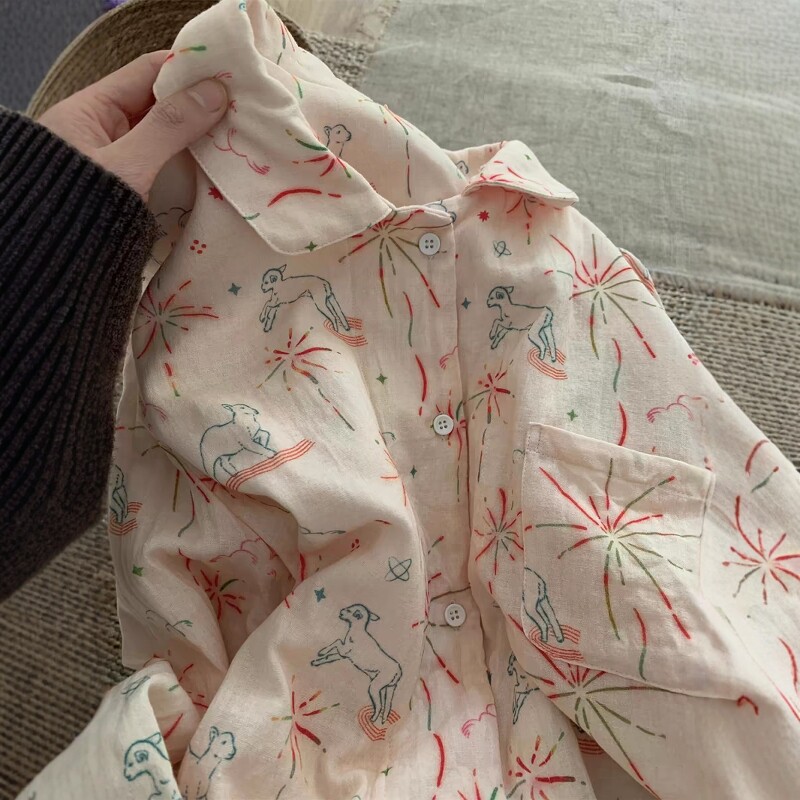 少女甜美烟火小狗印花开衫睡衣2025春秋季小翻领家居服大码两件套