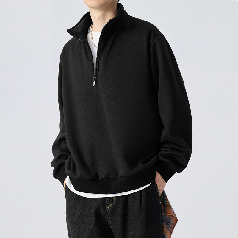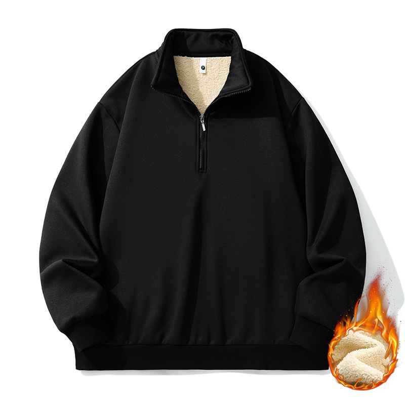 秋冬新款大码男装羊羔绒立领卫衣加绒加厚保暖半拉链上衣黑色外套