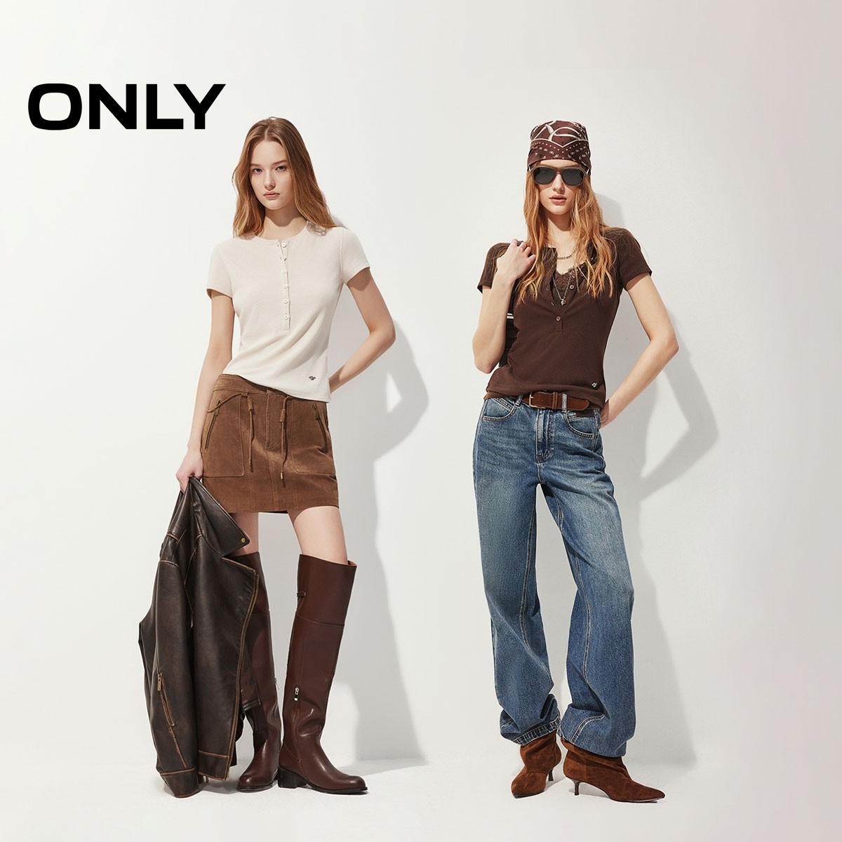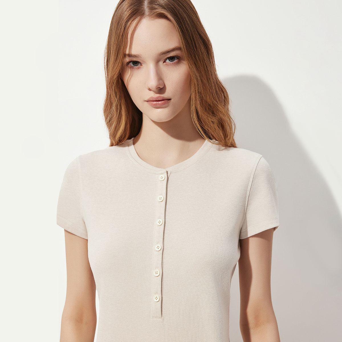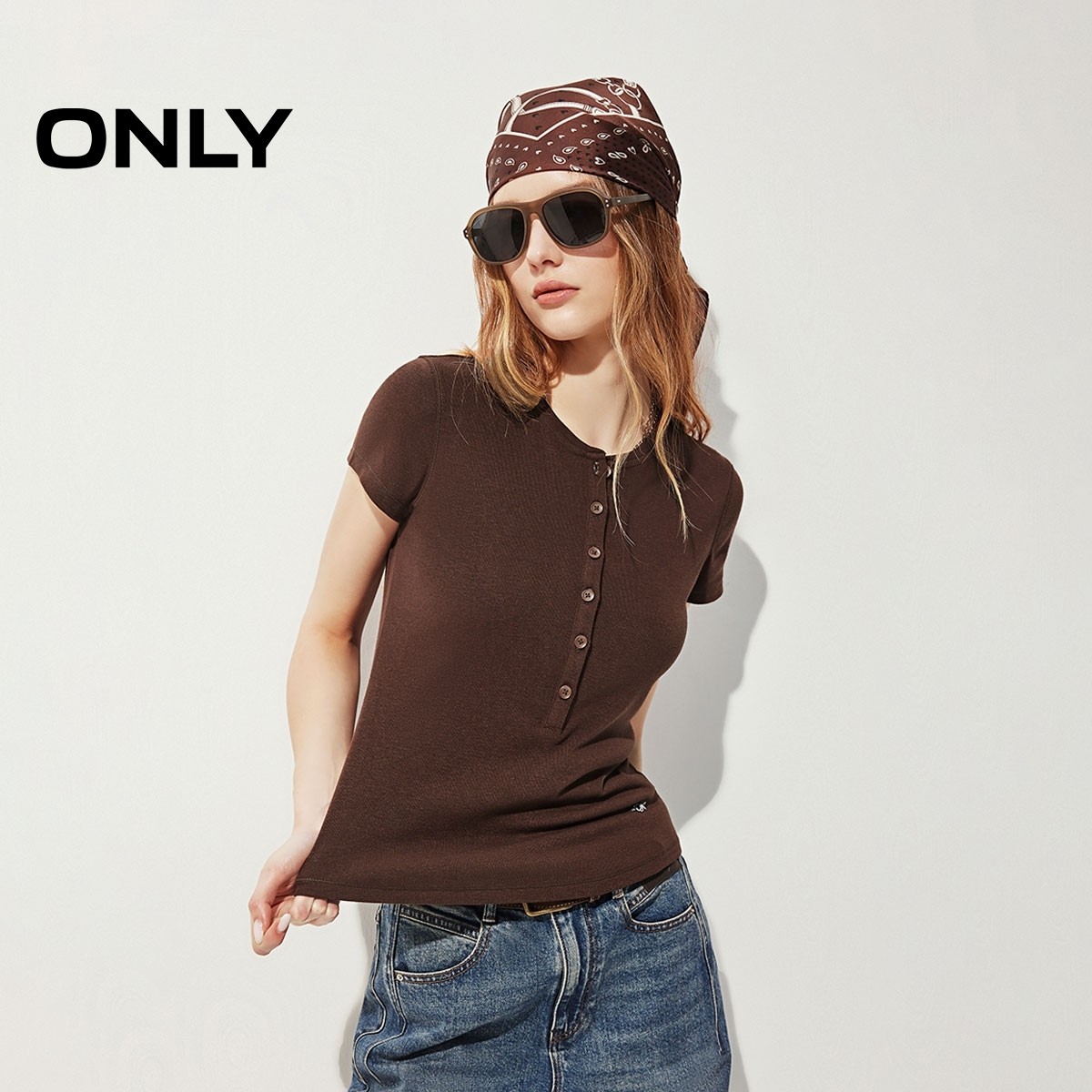 ONLY2026春季新款简约柔软同色排扣圆领短袖纯色正肩修身T恤女
