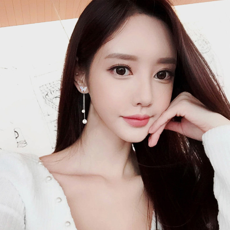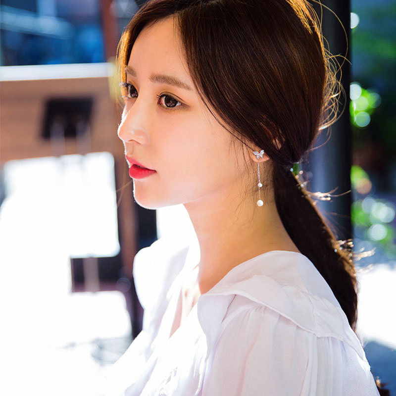 韩版S925纯银针蝴蝶结耳环女生气质长款珍珠耳坠个性百搭耳钉饰品