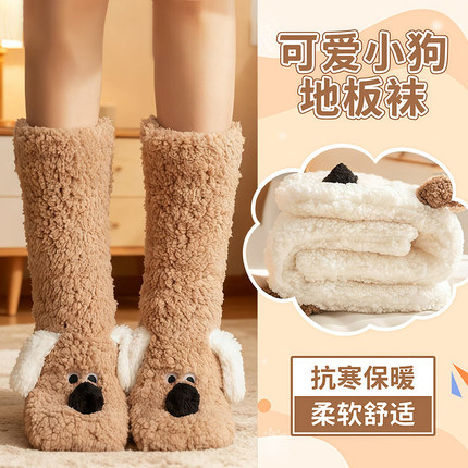 可爱小狗加绒加厚居家防滑地板袜秋冬暖脚保暖袜女睡眠袜圣诞袜子