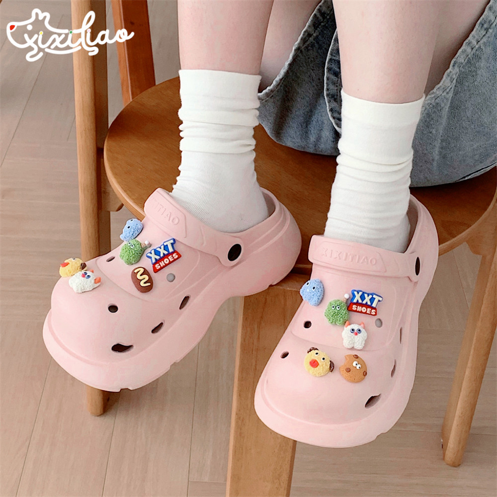 细细条 女士户外穿洞洞鞋夏季趣味卡通小怪兽厚底拿铁色沙滩凉拖