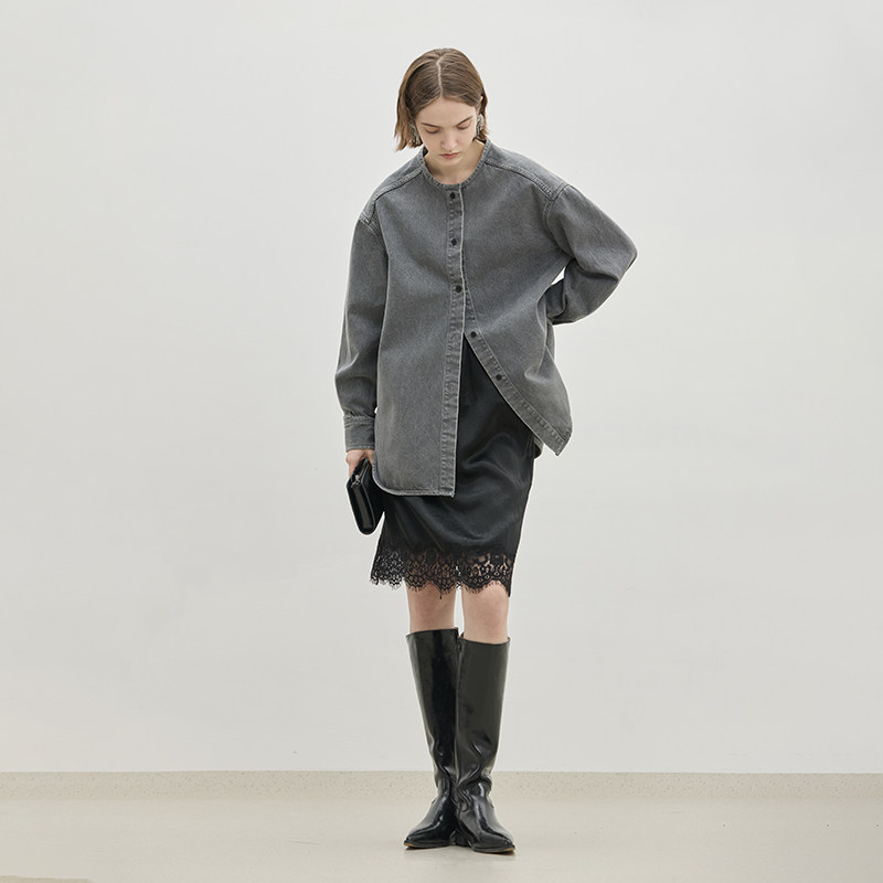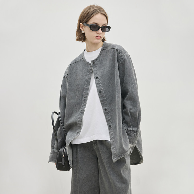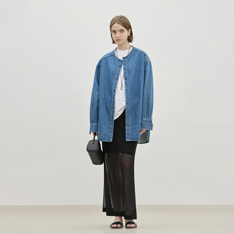圆领廓形牛仔衬衫,休闲中长款