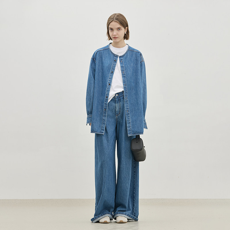 BLUEWEDIAN2025春秋宽松圆领廓形牛仔衬衫女 棉质休闲中长款衬衣