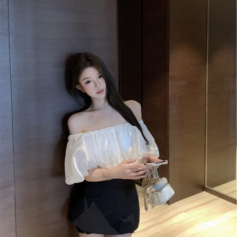 一字肩白色短袖衬衫女夏季法式甜美宽松衬衣气质设计感露肩小上衣