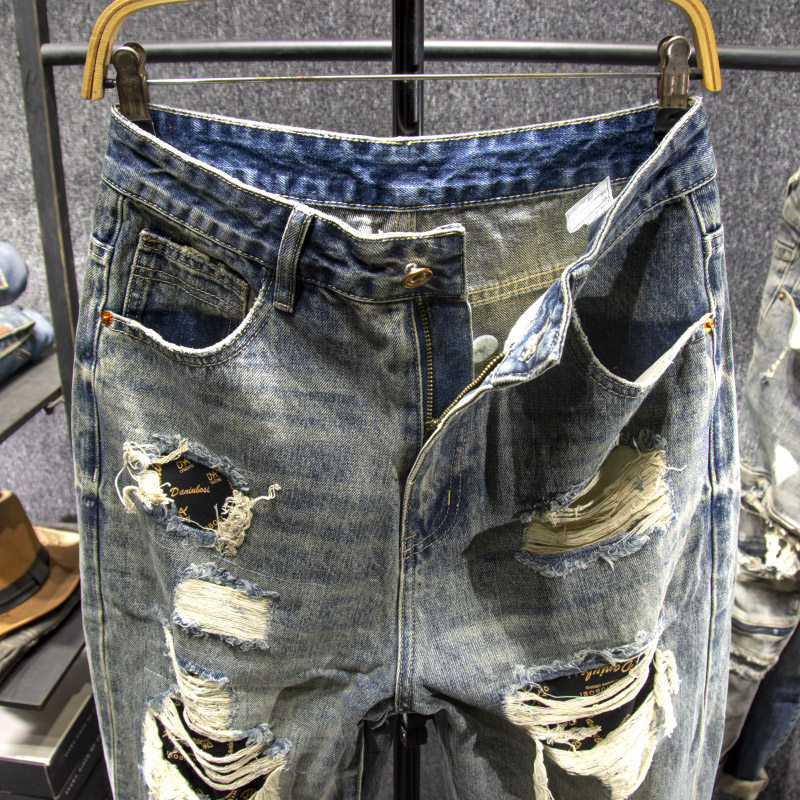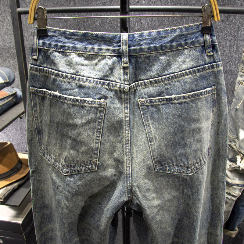 三古木棉日系大码复古乞丐破洞牛仔裤男宽松直筒贴布哈伦裤子男