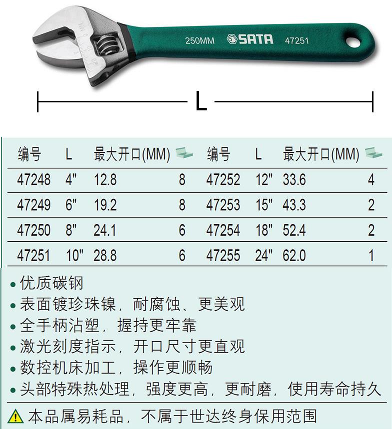 世达SATA保用活动扳手8/10/12寸活扳手开口板子活口扳手活络47248