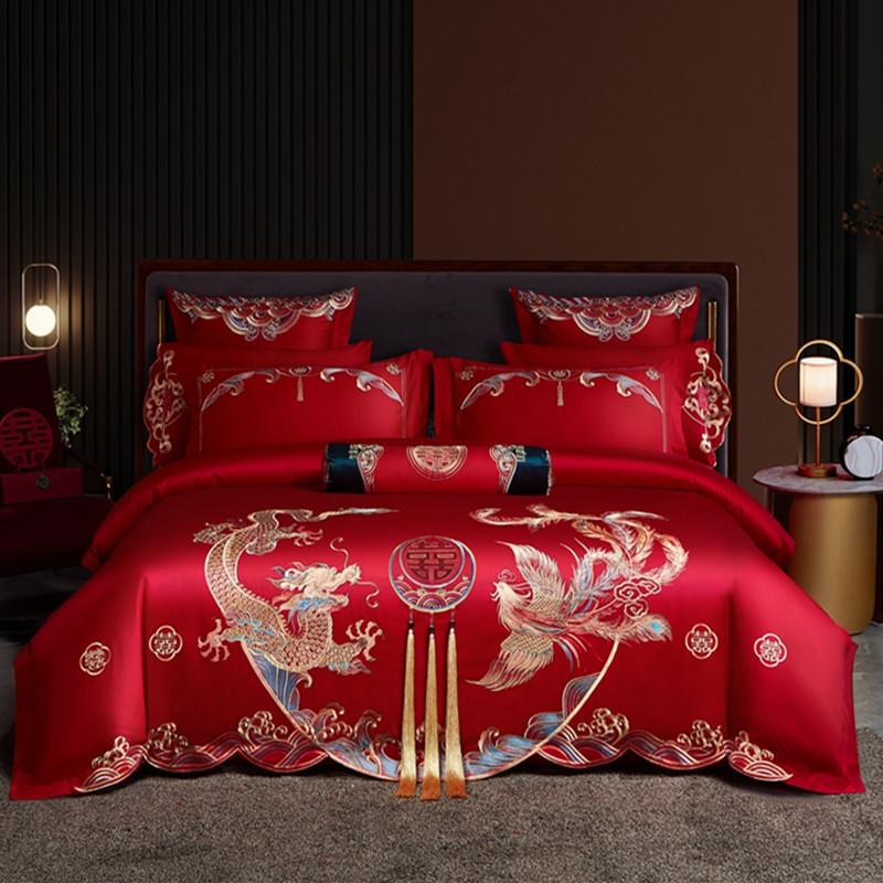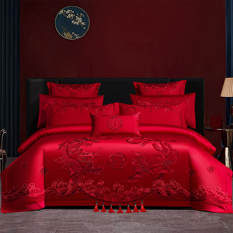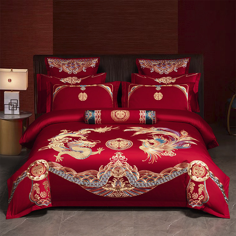 100支长绒棉婚庆四件套全棉刺绣纯棉大红色婚房龙凤结婚床上用品4