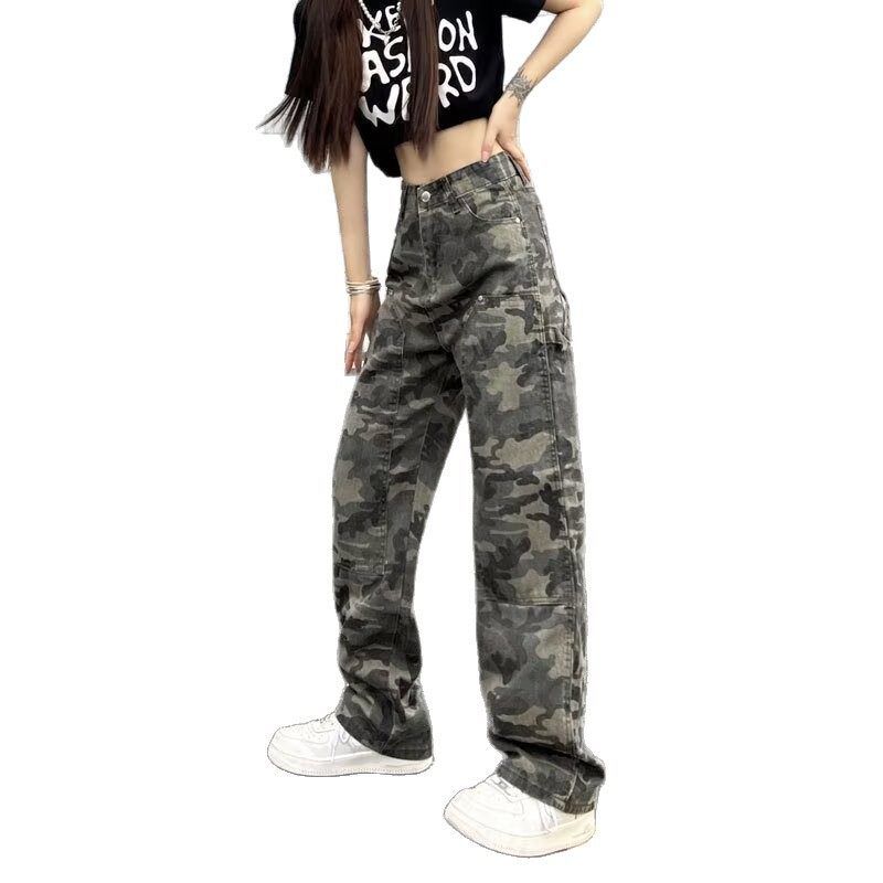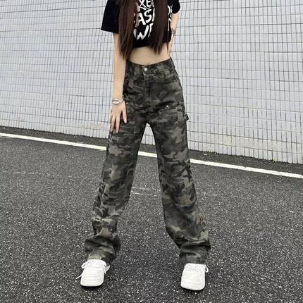 迷彩阔腿牛仔裤女2025年春秋季新款高腰直筒学生韩版军绿工装长裤