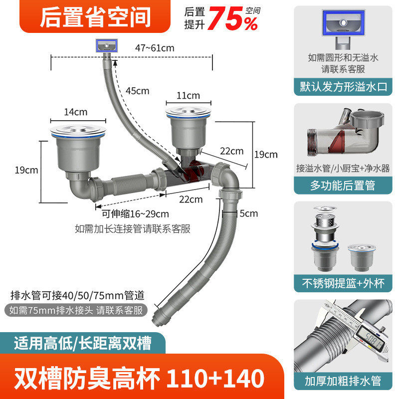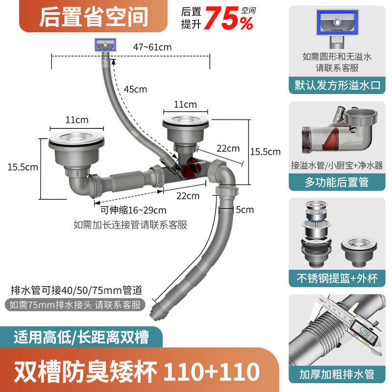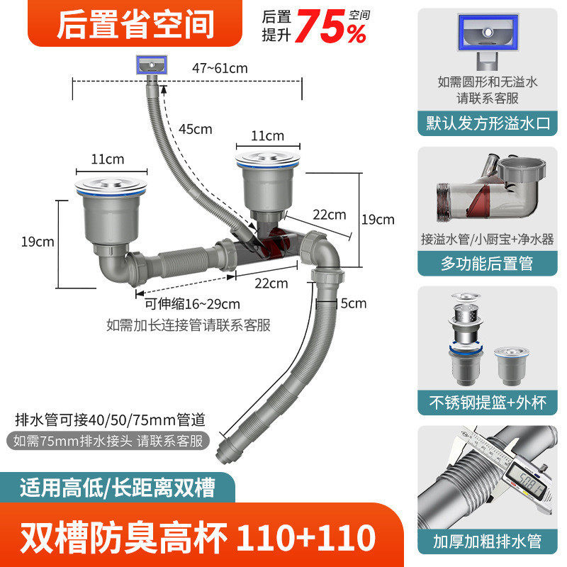 厨房下水管不锈钢洗菜盆排水管配件可全套防返臭味双槽下水器伸缩