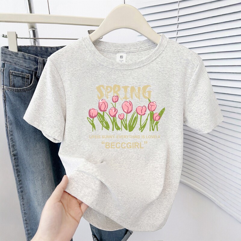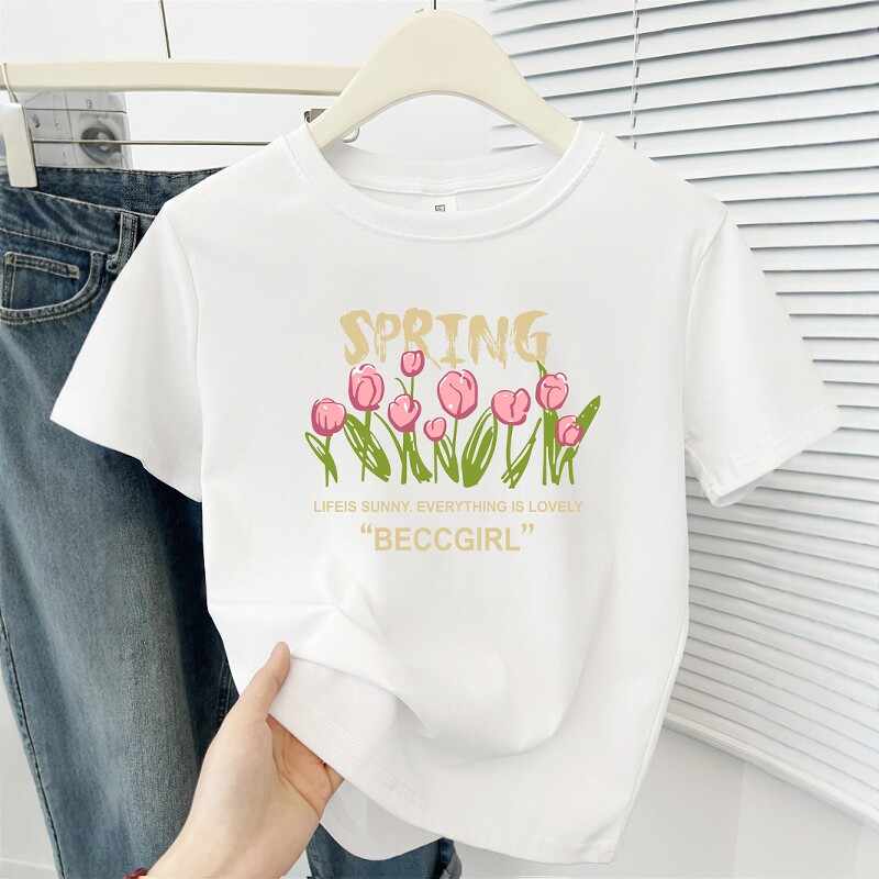 韩系火龙果色正肩印花短袖t恤女夏季新款洋气百搭小个子短款上衣