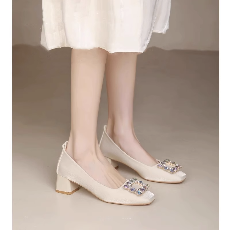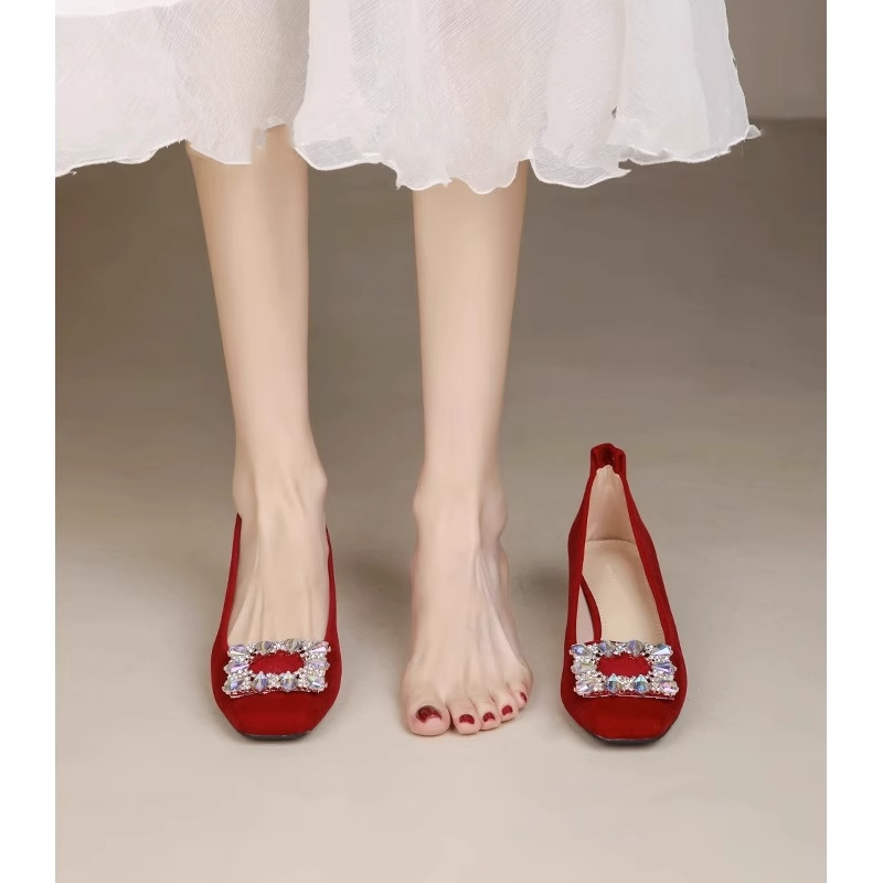 秀禾婚鞋新娘鞋水钻粗跟红色高跟鞋女方头浅口单鞋2025新款不累脚