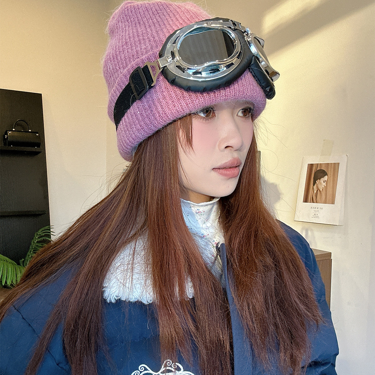 韩版ins秋冬季加厚针织帽子女滑雪保暖眼镜帽护耳飞行员毛线帽男